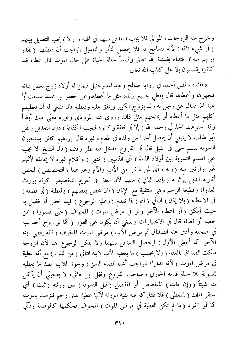 وَنَقَلَ ابْنُ هَانِئٍ: لَا يُعْجِبُنِي أَنْ يَأْكُلَ مِنْهُ شَيْئًا (وَإِنْ مَاتَ) الْمُخَصِّصُ أَوْ الْمُفَضِّلُ (قَبْلَ التَّسْوِيَةِ) بَيْنَ وَرَثَتِهِ (ثَبَتَ) أَيْ: اسْتَقَرَّ الْمِلْكُ (لِلْمُعْطَى) فَلَا يُشَارِكُهُ فِيهِ بَقِيَّةُ الْوَرَثَةِ لِأَنَّهَا عَطِيَّةٌ لِذِي رَحِمٍ فَلَزِمَتْ بِالْمَوْتِ كَمَا لَوْ انْفَرَدَ (مَا لَمْ تَكُنْ الْعَطِيَّةُ فِي مَرَضِ الْمَوْتِ) الْمَخُوفِ، فَحُكْمُهَا كَالْوَصِيَّةِ وَيَأْتِي