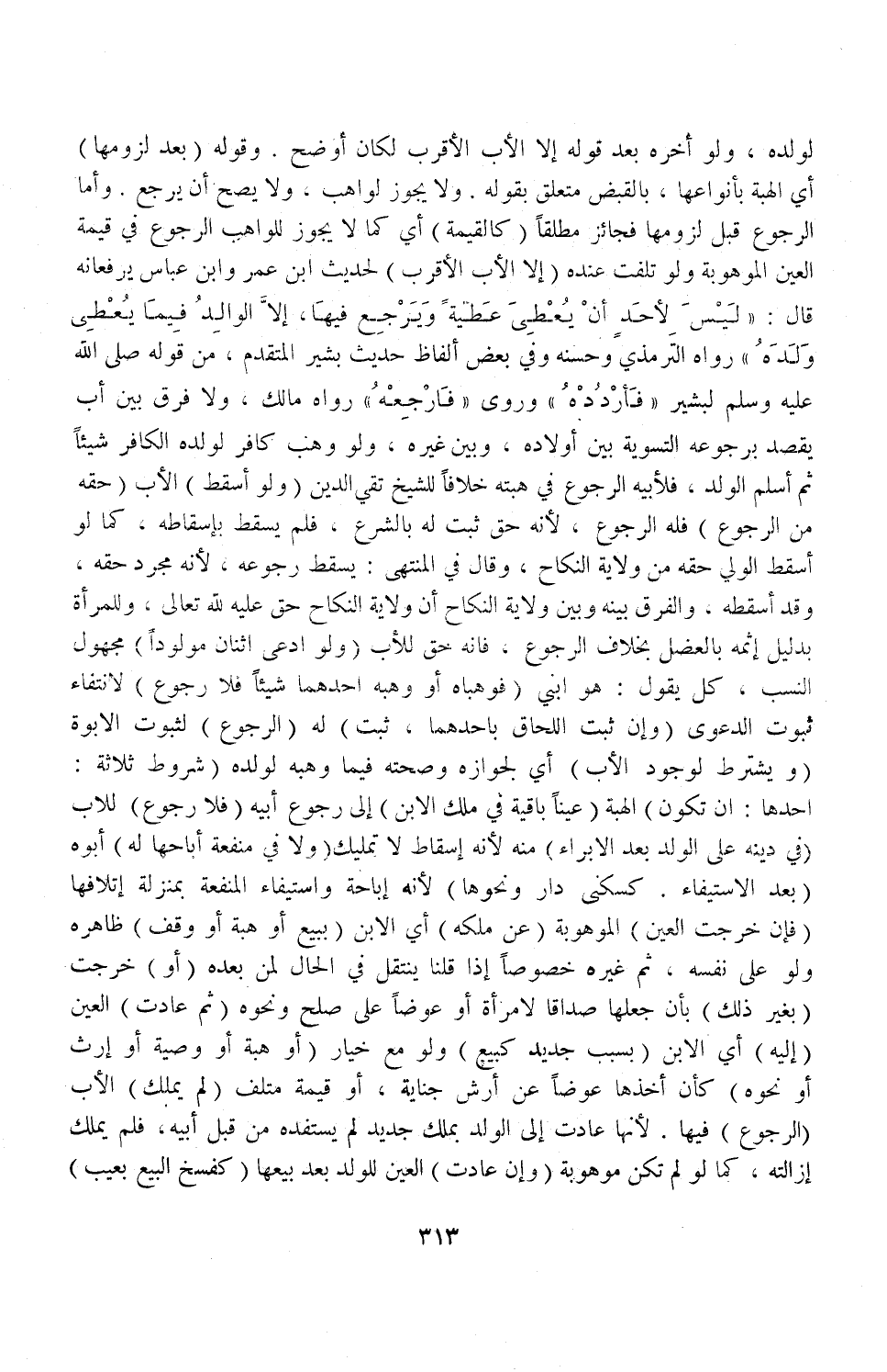 وَقَوْلُهُ (بَعْدَ لُزُومِهَا) أَيْ: الْهِبَةِ بِأَنْوَاعِهَا، بِالْقَبْضِ مُتَعَلِّقٌ بِقَوْلِهِ وَلَا يَجُوزُ لِوَاهِبٍ، وَلَا يَصِحُّ أَنْ يَرْجِعَ وَأَمَّا الرُّجُوعُ قَبْلَ لُزُومِهَا فَجَائِزٌ مُطْلَقًا (كَالْقِيمَةِ) أَيْ: كَمَا لَا يَجُوزُ لِلْوَاهِبِ الرُّجُوعُ فِي قِيمَةِ الْعَيْنِ الْمَوْهُوبَةِ وَلَوْ تَلِفَتْ عِنْدَهُ (إلَّا الْأَبَ الْأَقْرَبَ) لِحَدِيثِ ابْنِ عُمَرَ وَابْنِ عَبَّاسٍ يَرْفَعَانِهِ قَالَ: «لَيْسَ لِأَحَدٍ أَنْ يُعْطِيَ عَطِيَّةً وَيَرْجِعَ فِيهَا، إلَّا الْوَالِدُ فِيمَا يُعْطِي وَلَدَهُ» رَوَاهُ التِّرْمِذِيُّ وَحَسَّنَهُ.