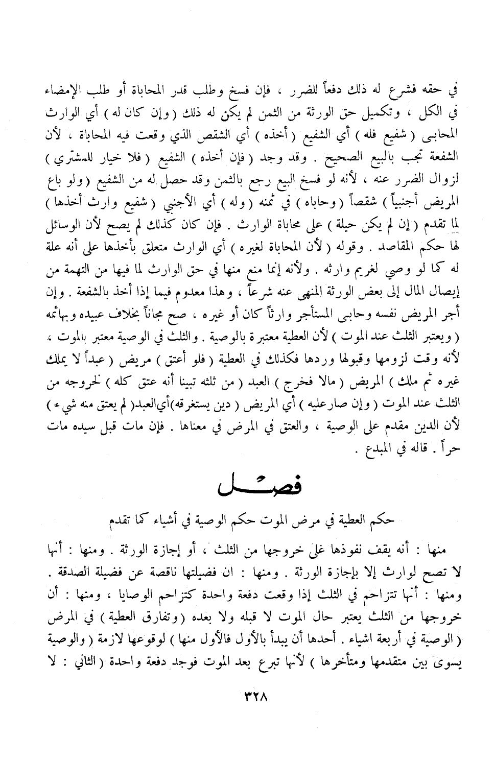 (فَصْلٌ) حُكْمُ الْعَطِيَّةِ فِي مَرَضِ الْمَوْتِ حُكْمُ الْوَصِيَّةِ فِي أَشْيَاءَ كَمَا تَقَدَّمَ مِنْهَا أَنَّهُ يَقِفُ نُفُوذُهَا عَلَى خُرُوجِهَا مِنْ الثُّلُثِ، أَوْ إجَازَةِ الْوَرَثَةِ وَمِنْهَا: أَنَّهَا لَا تَصِحُّ لِوَارِثٍ إلَّا بِإِجَازَةِ الْوَرَثَةِ وَمِنْهَا: أَنَّ فَضِيلَتَهَا نَاقِصَةٌ عَنْ فَضِيلَةِ الصَّدَقَةِ وَمِنْهَا: أَنَّهَا تَتَزَاحَمُ فِي الثُّلُثِ إذَا وَقَعَتْ دَفْعَةً وَاحِدَةً كَتَزَاحُمِ الْوَصَايَا، وَمِنْهَا: أَنَّ خُرُوجَهَا مِنْ الثُّلُثِ يُعْتَبَرُ حَالَ الْمَوْتِ لَا قَبْلَهُ وَلَا بَعْدَهُ.
