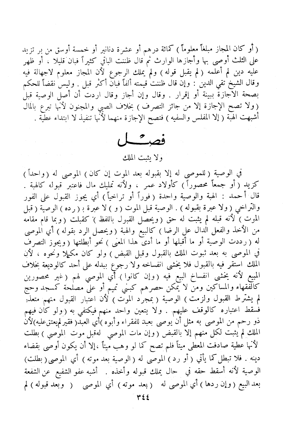 فَصْلٌ (وَلَا يَثْبُتُ الْمِلْكُ) فِي الْوَصِيَّةِ (لِلْمُوصَى لَهُ إلَّا بِقَبُولِهِ بَعْدَ الْمَوْتِ إنْ كَانَ) الْمُوصَى لَهُ.