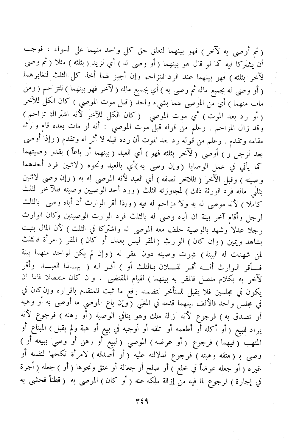 (ثُمَّ أَوْصَى بِهِ لِآخَرَ) فَهُوَ بَيْنَهُمَا لِتَعَلُّقِ حَقِّ كُلِّ وَاحِدٍ مِنْهُمَا عَلَى السَّوَاءِ، فَوَجَبَ أَنْ يَشْتَرِكَا فِيهِ كَمَا لَوْ قَالَ هُوَ بَيْنَهُمَا (أَوْ وَصَّى لَهُ) أَيْ: لِزَيْدٍ (بِثُلُثِهِ) مَثَلًا (ثُمَّ وَصَّى لِآخَرَ بِثُلُثِهِ) فَهُوَ بَيْنَهُمَا عِنْدَ الرَّدِّ لِلتَّزَاحُمِ وَإِنْ أُجِيزَ لَهُمَا أَخْذُ كُلِّ الثُّلُثِ لِتَغَايُرِهِمَا (أَوْ وَصَّى لَهُ بِجَمِيعِ مَالِهِ ثُمَّ وَصَّى بِهِ) أَيْ: بِجَمِيعِ مَالِهِ (لِآخَرَ فَهُوَ بَيْنَهُمَا) لِلتَّزَاحُمِ (وَمَنْ مَاتَ مِنْهُمَا) أَيْ: مِنْ الْمُوصَى لَهُمَا بِشَيْءٍ وَاحِدٍ (قَبْلَ مَوْتِ الْمُوصِي) كَانَ الْكُلُّ لِلْآخَرِ (أَوْ رُدَّ بَعْدَ الْمَوْتِ) أَيْ: مَوْتِ الْمُوصِي (كَانَ الْكُلُّ لِلْآخَرِ لِأَنَّهُ اشْتِرَاكُ تَزَاحُمٍ) وَقَدْ زَالَ الْمُزَاحِمُ وَعُلِمَ مِنْ قَوْلِهِ: قَبْلَ مَوْت الْمُوصِي أَنَّهُ لَوْ مَاتَ بَعْدَهُ قَامَ وَارِثُهُ مَقَامَهُ وَتَقَدَّمَ وَعُلِمَ مِنْ قَوْلِهِ رُدَّ بَعْدَ الْمَوْتِ أَنَّ رَدَّهُ قَبْلَهُ لَا أَثَرَ لَهُ وَتَقَدَّمَ.