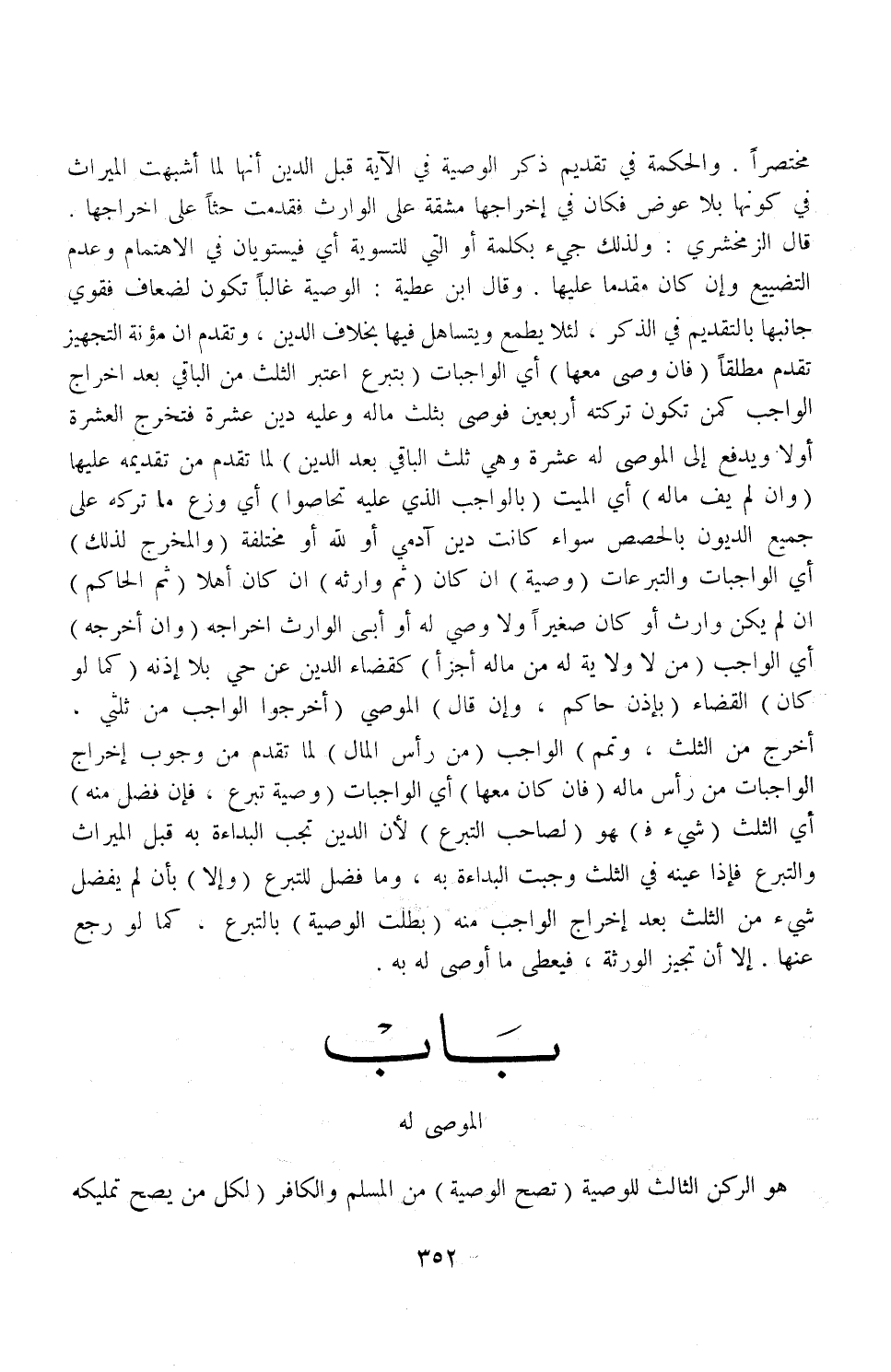 مُخْتَصَرًا وَالْحِكْمَةُ فِي تَقْدِيمِ ذِكْرِ الْوَصِيَّةِ فِي الْآيَةِ قَبْلَ الدَّيْنِ أَنَّهَا لَمَّا أَشْبَهَتْ الْمِيرَاثَ فِي كَوْنِهَا بِلَا عِوَضٍ فَكَانَ فِي إخْرَاجِهَا مَشَقَّةٌ عَلَى الْوَارِثِ فَقُدِّمَتْ حَثًّا عَلَى إخْرَاجِهَا قَالَ الزَّمَخْشَرِيُّ: وَلِذَلِكَ جِيءَ بِكَلِمَةِ " أَوْ " الَّتِي لِلتَّسْوِيَةِ أَيْ: فَيَسْتَوِيَانِ فِي الِاهْتِمَامِ وَعَدَمِ التَّضْيِيعِ وَإِنْ كَانَ مُقَدَّمًا عَلَيْهَا وَقَالَ ابْنُ عَطِيَّةَ: الْوَصِيَّةُ غَالِبًا تَكُونُ لِضِعَافِ فَقَوِيَ جَانِبُهَا بِالتَّقْدِيمِ فِي الذِّكْرِ، لِئَلَّا يُطْمَعَ وَيُتَسَاهَلَ فِيهَا بِخِلَافِ الدَّيْنِ، وَتَقَدَّمَ أَنَّ مُؤْنَةَ التَّجْهِيزِ تُقَدَّمُ مُطْلَقًا.