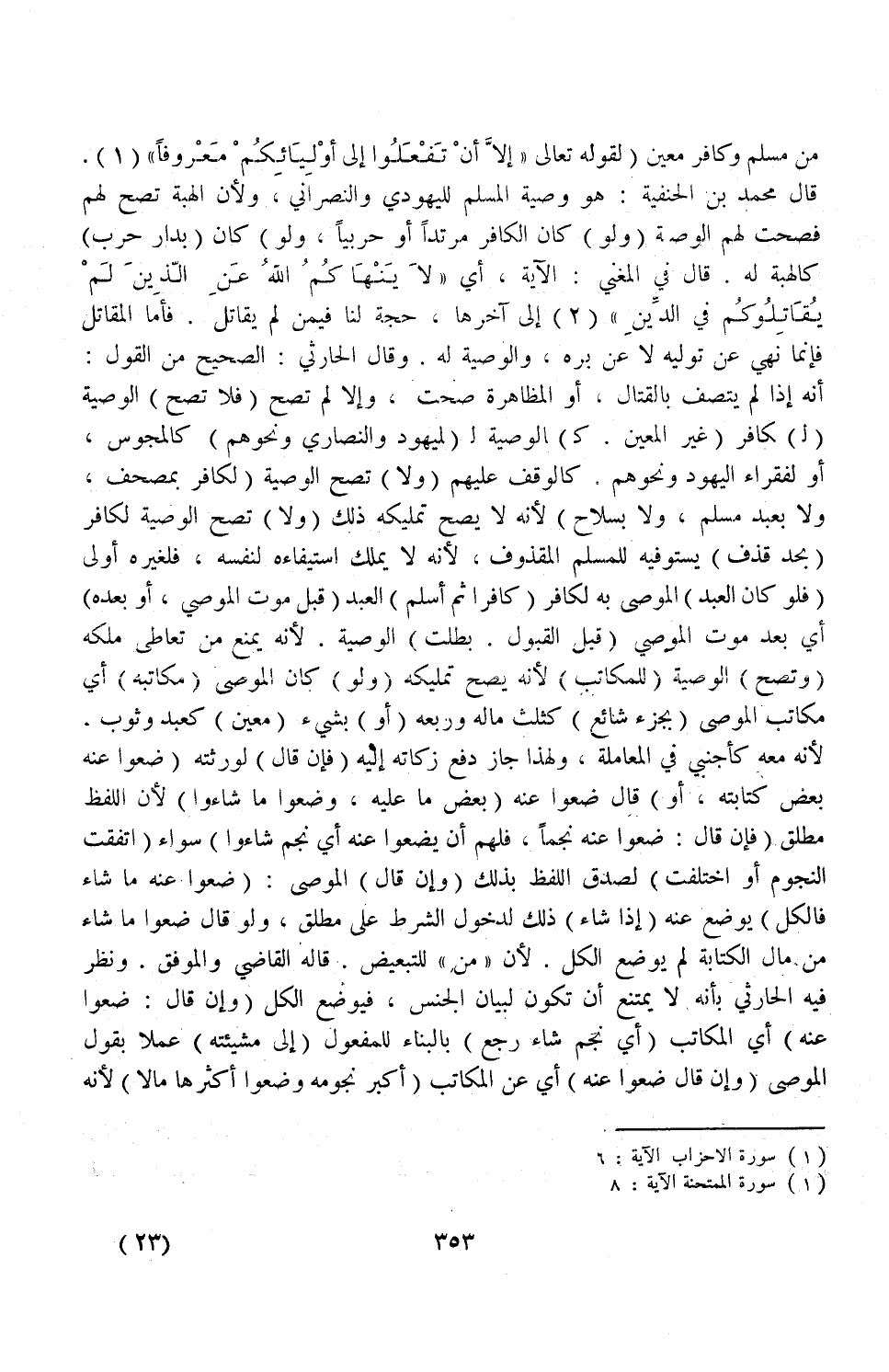 مِنْ مُسْلِمٍ وَكَافِرٍ مُعَيَّنٍ) لِقَوْلِهِ تَعَالَى {إِلا أَنْ تَفْعَلُوا إِلَى أَوْلِيَائِكُمْ مَعْرُوفًا} [الأحزاب: ٦] قَالَ مُحَمَّدُ بْنُ الْحَنَفِيَّةِ: هُوَ وَصِيَّةُ الْمُسْلِمِ لِلْيَهُودِيِّ وَالنَّصْرَانِيِّ، وَلِأَنَّ الْهِبَةَ تَصِحُّ لَهُمْ فَصَحَّتْ لَهُمْ الْوَصِيَّةُ.