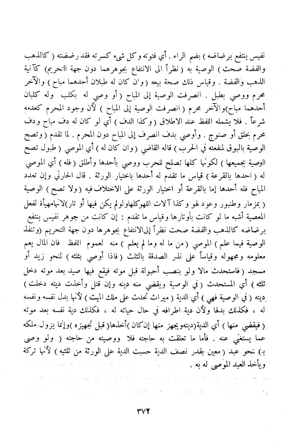 نَفِيسٍ يُنْتَفَعُ بِرُضَاضِهِ) بِضَمِّ الرَّاءِ أَيْ: فَتُوتِهِ وَكُلَّ شَيْءٍ كَسَرْته فَقَدْ رَضَضْته (كَالذَّهَبِ وَالْفِضَّةِ صَحَّتْ) الْوَصِيَّةُ بِهِ (نَظَرًا إلَى الِانْتِفَاعِ بِجَوْهَرِهِمَا دُونَ جِهَةِ التَّحْرِيمِ) كَآنِيَةِ الذَّهَبِ وَالْفِضَّةِ وَقِيَاسُ ذَلِكَ صِحَّةُ بَيْعِهِ.