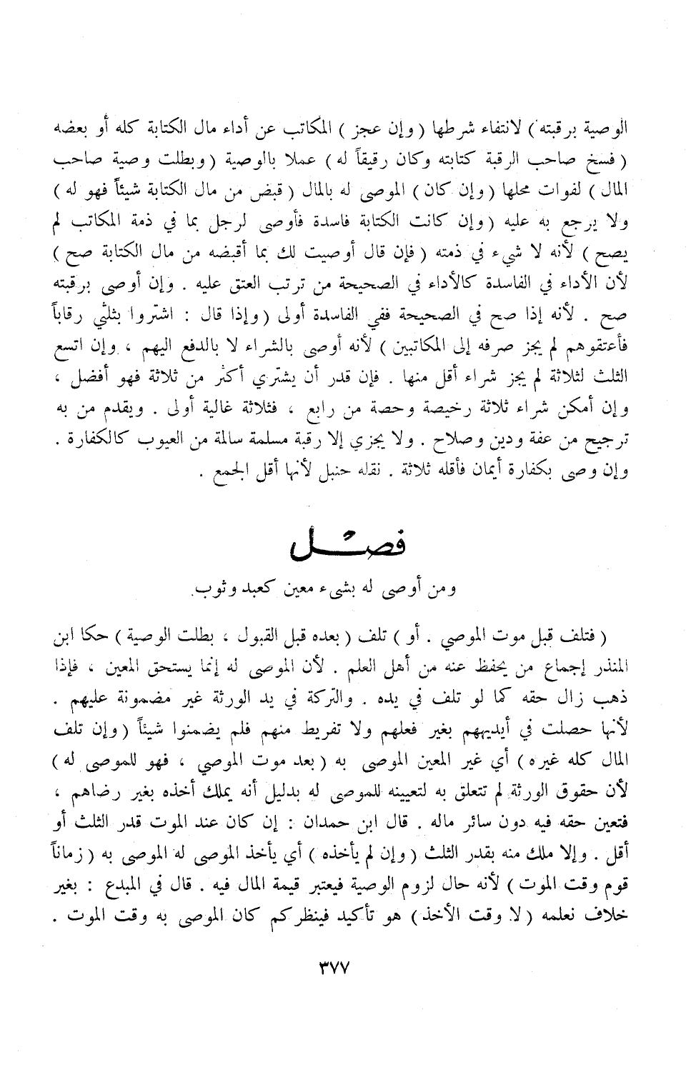 (فَصْلٌ وَمَنْ أُوصِيَ لَهُ بِشَيْءٍ مُعَيَّنٍ كَعَبْدٍ وَثَوْبٍ) (فَتَلِفَ قَبْلَ مَوْتِ الْمُوصِي أَوْ) تَلِفَ (بَعْدَهُ قَبْلَ الْقَبُولِ، بَطَلَتْ الْوَصِيَّةُ) حَكَى ابْنُ الْمُنْذِرِ إجْمَاعَ مَنْ يَحْفَظُ عَنْهُ مِنْ أَهْلِ الْعِلْمِ لِأَنَّ الْمُوصَى لَهُ إنَّمَا يَسْتَحِقُّ الْمُعَيَّنَ، فَإِذَا ذَهَبَ زَالَ حَقُّهُ كَمَا لَوْ تَلِفَ فِي يَدِهِ وَالتَّرِكَةُ فِي يَدِ الْوَرَثَةِ غَيْرُ مَضْمُونَةٍ عَلَيْهِمْ لِأَنَّهَا حَصَلَتْ فِي أَيْدِيهمْ بِغَيْرِ فِعْلِهِمْ وَلَا تَفْرِيطَ مِنْهُمْ فَلَمْ يَضْمَنُوا شَيْئًا (وَإِنْ تَلِفَ الْمَالُ كُلُّهُ غَيَّرَهُ) أَيْ: غَيَّرَ الْمُعَيَّنَ الْمُوصَى بِهِ (بَعْدَ مَوْتِ الْمُوصِي، فَهُوَ لِلْمُوصَى لَهُ) لِأَنَّ حُقُوقَ الْوَرَثَةِ لَمْ تَتَعَلَّقْ بِهِ لِتَعْيِينِهِ لِلْمُوصَى لَهُ بِدَلِيلِ أَنَّهُ يَمْلِكُ أَخْذَهُ بِغَيْرِ رِضَاهُمْ، فَتَعَيَّنَ حَقُّهُ فِيهِ دُونَ سَائِرِ مَالِهِ قَالَ ابْنُ حَمْدَانَ: إنْ كَانَ عِنْدَ الْمَوْتِ قَدْرَ الثُّلُثِ أَوْ أَقَلَّ وَإِلَّا مَلَكَ مِنْهُ بِقَدْرِ الثُّلُثِ.