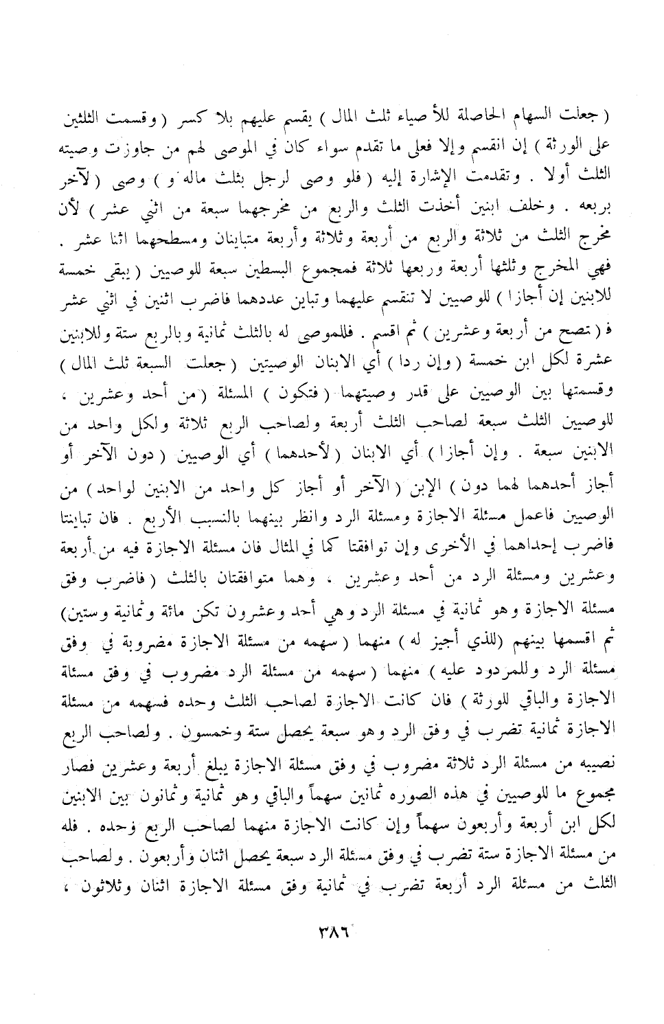 وَلِصَاحِبِ الثُّلُثِ مِنْ مَسْأَلَةِ الرَّدِّ أَرْبَعَةٌ تَضْرِبُ فِي ثَمَانِيَةٍ وَفْقَ مَسْأَلَةِ الْإِجَازَةِ اثْنَانِ وَثَلَاثُونَ