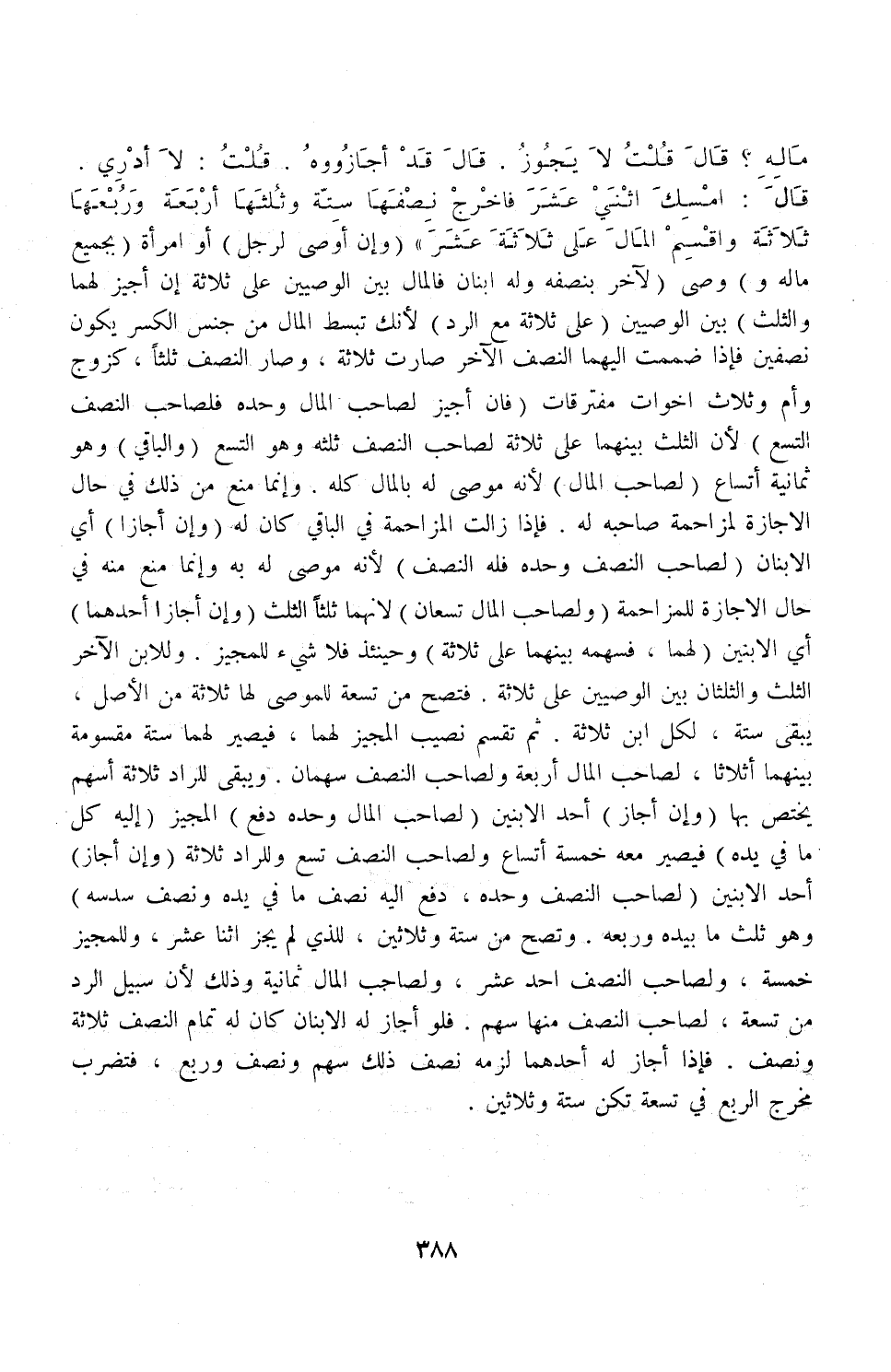 مَالِهِ قَالَ: قُلْت: لَا يَجُوزُ قَالَ: قَدْ أَجَازُوهُ قُلْتُ: لَا أَدْرِي قَالَ: أَمْسِكْ اثْنَيْ عَشَرَ فَأَخْرِجْ نِصْفهَا سِتَّةً وَثُلُثهَا أَرْبَعَةً وَرُبُعهَا ثَلَاثَةً وَاقْسِمْ الْمَالَ عَلَى ثَلَاثَةَ عَشَرَ ".