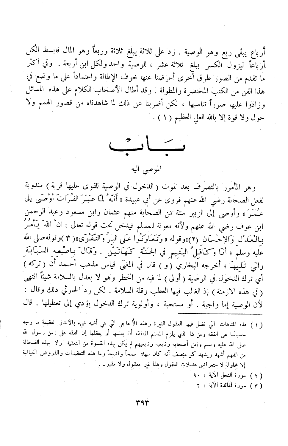 ِ وَهُوَ الْمَأْمُورُ بِالتَّصَرُّفِ بَعْدَ الْمَوْتِ (الدُّخُولُ فِي الْوَصِيَّةِ لِلْقَوِيِّ عَلَيْهَا قُرْبَةً) مَنْدُوبَةً لِفِعْلِ الصَّحَابَةِ - رَضِيَ اللَّهُ عَنْهُمْ - فَرُوِيَ عَنْ أَبِي عُبَيْدَةَ (أَنَّهُ لَمَّا عَبَرَ الْفُرَاتَ أَوْصَى إلَى عُمَرَ) وَأَوْصَى إلَى الزُّبَيْرِ سِتَّةً مِنْ الصَّحَابَةِ مِنْهُمْ عُثْمَانُ وَابْنُ مَسْعُودٍ وَعَبْدُ الرَّحْمَنِ بْنُ عَوْفٍ - رَضِيَ اللَّهُ عَنْهُمْ - وَلِأَنَّهُ مَعُونَةٌ لِلْمُسْلِمِ فَيَدْخُلُ تَحْتَ قَوْله تَعَالَى: {إِنَّ اللَّهَ يَأْمُرُ بِالْعَدْلِ وَالإِحْسَانِ} [النحل: ٩٠] وَقَوْلِهِ: {وَتَعَاوَنُوا عَلَى الْبِرِّ وَالتَّقْوَى} [المائدة: ٢] وَقَوْلُهُ: «أَنَا وَكَافِلُ الْيَتِيمِ فِي الْجَنَّةِ كَهَاتَيْنِ وَقَالَ بِإِصْبَعِهِ السَّبَّابَةِ وَاَلَّتِي تَلِيهَا» أَخْرَجَهُ الْبُخَارِيُّ (، وَ) قَالَ فِي الْمُغْنِي قِيَاسُ مَذْهَبِ أَحْمَدَ أَنَّ (تَرْكَهُ) أَيْ: تَرْكَ الدُّخُولِ فِي الْوَصِيَّةِ (أَوْلَى) لِمَا فِيهِ مِنْ الْخَطَرِ وَهُوَ لَا يَعْدِلُ بِالسَّلَامَةِ شَيْئًا انْتَهَى (فِي هَذِهِ الْأَزْمِنَةِ) إذْ الْغَالِبُ فِيهَا الْعَطَبُ وَقِلَّةُ السَّلَامَةِ لَكِنْ رَدَّ الْحَارِثِيُّ ذَلِكَ وَقَالَ: لِأَنَّ الْوَصِيَّةَ إمَّا وَاجِبَةٌ أَوْ مُسْتَحَبَّةٌ، وَأَوْلَوِيَّةُ تَرْكِ الدُّخُولِ يُؤَدِّي إلَى تَعْطِيلِهَا قَالَ