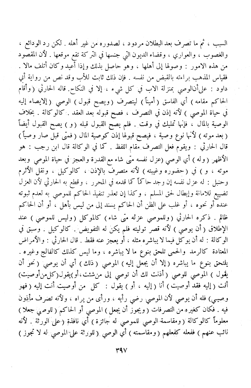 السَّبَبِ، ثُمَّ مَا تَصَرَّفَ بَعْدَ الْبُطْلَانِ مَرْدُودٌ، لِصُدُورِهِ مِنْ غَيْرِ أَهْلِهِ لَكِنْ رَدَّ الْوَدَائِعَ، وَالْغُصُوبَ، وَالْعَوَارِيَّ، وَقَضَاءَ الدُّيُونِ الَّتِي جِنْسُهَا فِي التَّرِكَةِ تَقَعُ مَوْقِعَهَا لِأَنَّ الْمَقْصُودَ مِنْ هَذِهِ الْأُمُورِ: وُصُولُهَا إلَى أَهْلِهَا، وَهُوَ حَاصِلٌ بِذَلِكَ وَإِذَا أُعِيدَ وَكَانَ أَتْلَفَ مَالًا فَقِيَاسُ الْمَذْهَبِ بَرَاءَتُهُ بِالْقَبْضِ مِنْ نَفْسِهِ فَإِنَّ ذَلِكَ ثَابِتٌ لِلْأَبِ وَقَدْ نَصَّ مِنْ رِوَايَةِ أَبِي دَاوُد عَلَى أَنَّ الْوَصِيَّ بِمَنْزِلَةِ الْأَبِ فِي كُلِّ شَيْءٍ، إلَّا فِي النِّكَاحِ قَالَهُ الْحَارِثِيُّ (وَأَقَامَ الْحَاكِمُ مَقَامَهُ) أَيْ: الْفَاسِقِ (أَمِينًا) لِيَتَصَرَّفَ.