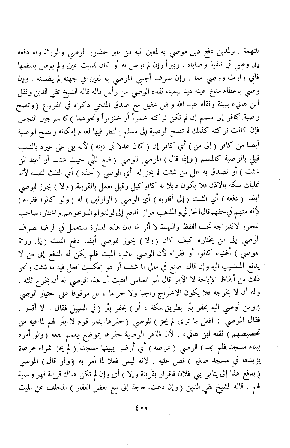 (وَمَنْ أُوصِيَ إلَيْهِ بِحَفْرِ بِئْرٍ بِطَرِيقِ مَكَّةَ، أَوْ) بِحَفْرِ بِئْرٍ (فِي السَّبِيلِ فَقَالَ: لَا أَقْدِرُ فَقَالَ الْمُوصِي: افْعَلْ مَا تَرَى لَمْ يَجُزْ) لِلْوَصِيِّ (حَفْرُهَا بِدَارِ قَوْمٍ لَا بِئْرَ لَهُمْ لِمَا فِيهِ مِنْ تَخْصِيصِهِمْ) نَقَلَهُ ابْنُ هَانِئٍ لِأَنَّ ظَاهِرَ الْوَصِيَّةِ حَفْرُهَا بِمَوْضِعٍ يُعَمَّمُ نَفْعُهُ.