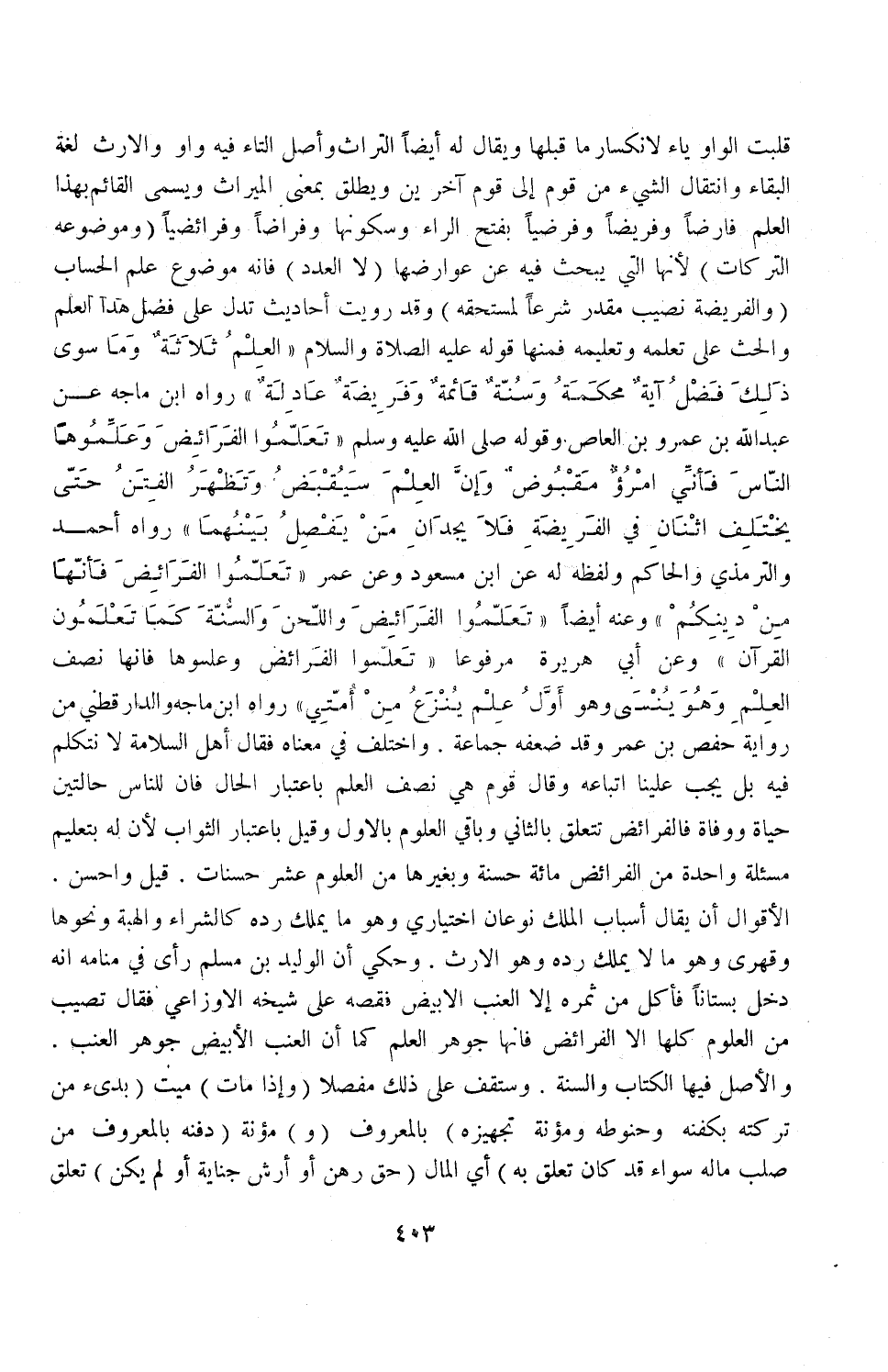 وَعَنْهُ أَيْضًا «تَعَلَّمُوا الْفَرَائِضَ وَاللَّحْنَ وَالسُّنَّةَ كَمَا تَعَلَّمُونَ الْقُرْآنَ» وَعَنْ أَبِي هُرَيْرَةَ مَرْفُوعًا «تَعَلَّمُوا الْفَرَائِضَ وَعَلِّمُوهَا فَإِنَّهَا نِصْفُ الْعِلْمِ وَهُوَ يُنْسَى وَهُوَ أَوَّلُ عِلْمٍ يُنْزَعُ مِنْ أُمَّتِي» رَوَاهُ ابْنُ مَاجَهْ وَالدَّارَقُطْنِيّ مِنْ رِوَايَةِ حَفْصِ بْنِ عُمَرَ وَقَدْ ضَعَّفَهُ جَمَاعَةٌ وَاخْتُلِفَ فِي مَعْنَاهُ فَقَالَ أَهْلُ السَّلَامَةِ لَا نَتَكَلَّم فِيهِ بَلْ يَجِبُ عَلَيْنَا اتِّبَاعُهُ وَقَالَ قَوْمٌ: هِيَ نِصْفُ الْعِلْمِ بِاعْتِبَارِ الْحَالِ فَإِنَّ لِلنَّاسِ حَالَتَيْنِ حَيَاةٌ وَوَفَاةٌ فَالْفَرَائِضُ تَتَعَلَّقُ بِالثَّانِي وَبَاقِي الْعُلُومِ بِالْأَوَّلِ وَقِيلَ بِاعْتِبَارِ الثَّوَابِ لِأَنَّ لَهُ بِتَعْلِيمِ مَسْأَلَةٍ وَاحِدَةٍ مِنْ الْفَرَائِضِ مِائَةَ حَسَنَةٍ وَبِغَيْرِهَا مِنْ الْعُلُومِ عَشْرَ حَسَنَاتٍ قِيلَ وَأَحْسَنُ الْأَقْوَالِ أَنْ يُقَالَ: