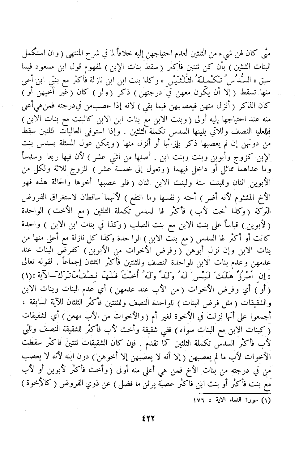 مَتَى كَانَ لَهُنَّ شَيْءٌ مِنْ الثُّلُثَيْنِ لِعَدَمِ احْتِيَاجهنَّ إلَيْهِ خِلَافًا لِمَا فِي شَرْحِ الْمُنْتَهَى (وَإِنْ اسْتَكْمَلَ الْبَنَاتُ الثُّلُثَيْنِ) بِأَنْ كُنَّ ثِنْتَيْنِ فَأَكْثَرَ (سَقَطَ بَنَاتُ الِابْنِ) لِمَفْهُومِ قَوْلِ ابْنِ مَسْعُودٍ فِيمَا سَبَقَ " السُّدُسُ تَكْمِلَة الثُّلُثَيْنِ " وَكَذَا بِنْتُ ابْنِ ابْنٍ نَازِلَةً فَأَكْثَرَ مَعَ بِنْتَيْ ابْنٍ أَعْلَى مِنْهَا تَسْقُطُ (إلَّا أَنْ يَكُونَ مَعَهُنَّ فِي دَرَجَتِهِنَّ) ذَكَرٌ.