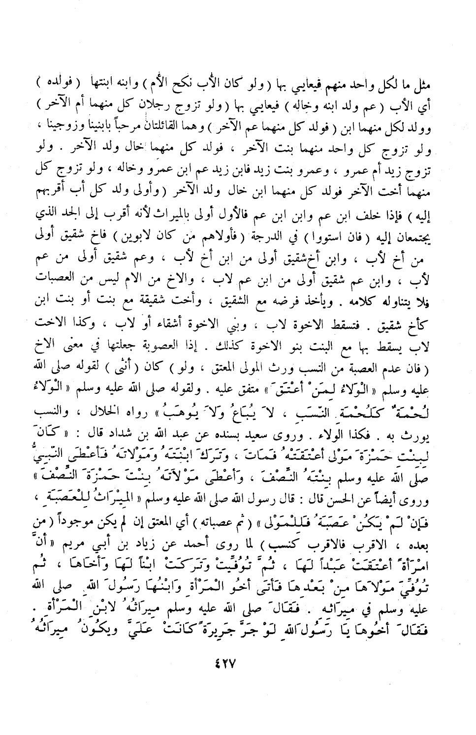 وَرَوَى سَعِيدٌ بِسَنَدِهِ عَنْ عَبْدِ اللَّهِ بْنِ شَدَّادٍ قَالَ: «كَانَ لِبِنْتِ حَمْزَةَ مَوْلَى أَعْتَقَتْهُ فَمَاتَ، وَتَرَكَ ابْنَتَهُ وَمُولَاتَهُ فَأَعْطَى النَّبِيَّ - صَلَّى اللَّهُ عَلَيْهِ وَسَلَّمَ - بِنْتَهُ النِّصْفَ، وَأَعْطَى مَوْلَاتَهُ بِنْتَ حَمْزَةَ النِّصْفَ» .