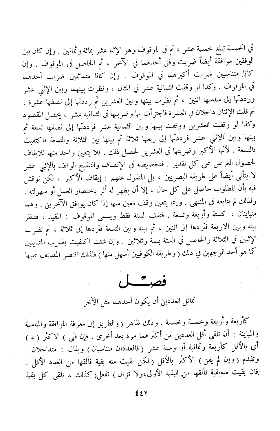 أَنْ يَكُونَ أَحَدُهُمَا مِثْل الْآخَرِ كَأَرْبَعَةٍ وَأَرْبَعَةٍ وَخَمْسَةٍ وَخَمْسَةٍ وَذَلِكَ ظَاهِرٌ (وَالطَّرِيقُ إلَى مَعْرِفَةِ الْمُوَافَقَةِ وَالْمُنَاسَبَةِ وَالْمُبَايَنَةِ: أَنْ تَلْقَى أَقَلَّ الْعَدَدَيْنِ مِنْ أَكْثَرِهِمَا مَرَّةً بَعْدَ أُخْرَى فَإِنْ فَنِيَ) الْأَكْثَرُ (بِهِ) أَيْ بِالْأَقَلِّ كَأَرْبَعَةٍ وَثَمَانِيَةٍ أَوْ وَسِتَّةَ عَشَرَ (فَالْعَدَدَانِ مُتَنَاسِبَانِ) وَيُقَالُ: مُتَدَاخِلَانِ وَتَقَدَّمَ (وَإِنْ لَمْ يَفْنَ) الْأَكْثَرُ بِالْأَقَلِّ (لَكِنْ بَقِيَتْ مِنْهُ بَقِيَّةٌ فَأَلْقِهَا مِنْ الْعَدَدِ الْأَقَلِّ فَإِنْ بَقِيَتْ مِنْهُ بَقِيَّةٌ فَأَلْقِهَا مِنْ الْبَقِيَّةِ الْأُولَى وَلَا تَزَالُ) تَفْعَلُ (كَذَلِكَ، تُلْقِي كُلَّ بَقِيَّةٍ