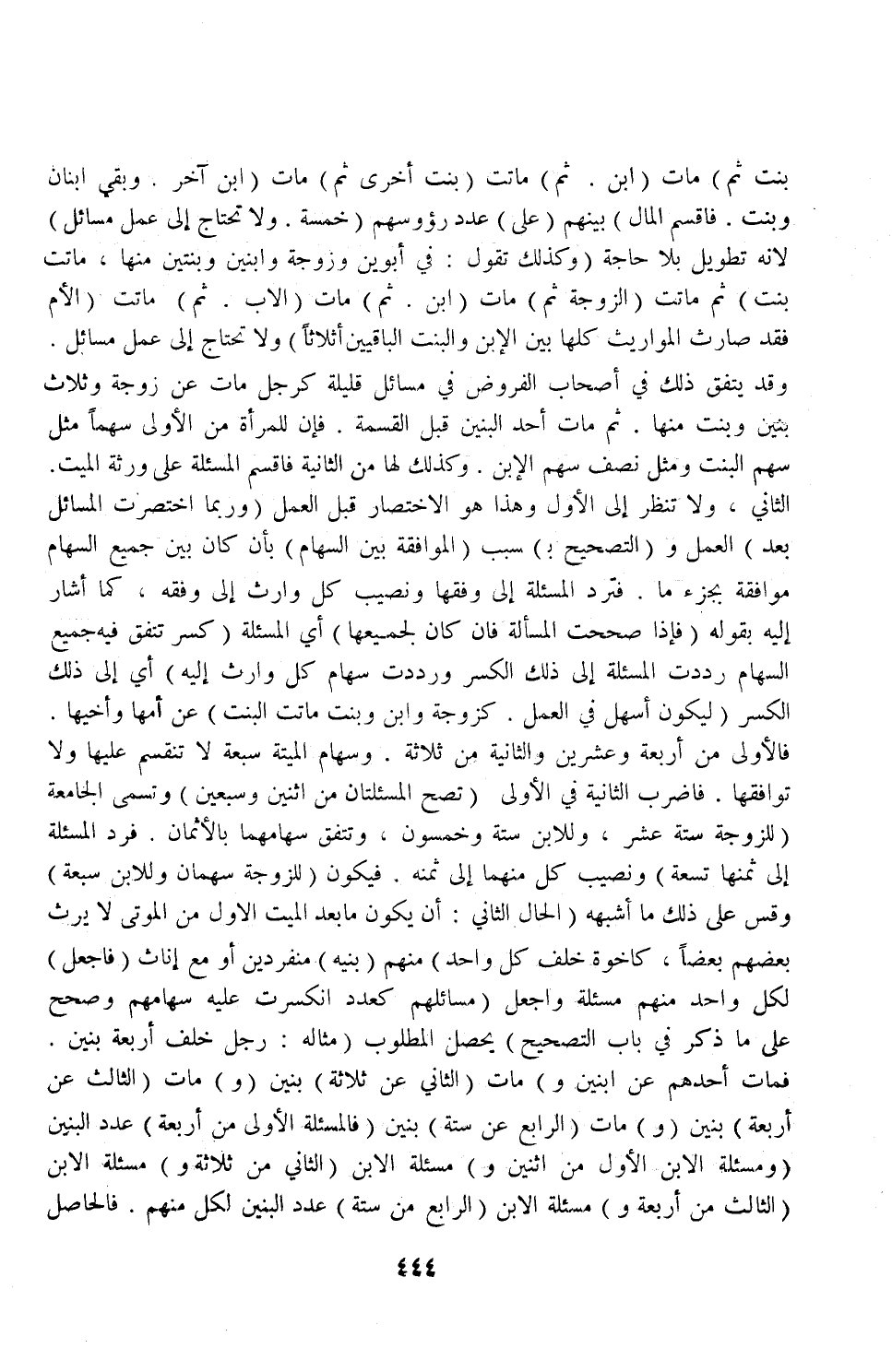 (الْحَالُ الثَّانِي: أَنْ يَكُونَ مَا بَعْدَ الْمَيِّتِ الْأَوَّلِ مِنْ الْمَوْتَى لَا يَرِثُ بَعْضُهُمْ بَعْضًا، كَإِخْوَةٍ خَلَفَ كُلُّ وَاحِدٍ) مِنْهُمْ (بَنِيهِ) مُنْفَرِدِينَ أَوْ مَعَ إنَاثٍ (فَاجْعَلْ) لِكُلِّ وَاحِدٍ مِنْهُمْ مَسْأَلَةً وَاجْعَلْ (مَسَائِلَهُمْ كَعَدَدٍ انْكَسَرَتْ عَلَيْهِ سِهَامُهُمْ وَصَحِّحْ عَلَى مَا ذُكِرَ فِي بَابِ التَّصْحِيحِ) يَحْصُلُ الْمَطْلُوبُ (مِثَالُهُ رَجُلٌ خَلَّفَ أَرْبَعَةَ بَنِينَ فَمَاتَ أَحَدَهُمْ عَنْ ابْنَيْنِ وَ) مَاتَ (الثَّانِي عَنْ ثَلَاثَةِ) بَنِينَ (وَ) مَاتَ (الثَّالِثُ عَنْ أَرْبَعَةِ) بَنِينَ (وَ) مَاتَ (الرَّابِعُ عَنْ سِتَّةِ) بَنِينَ (فَالْمَسْأَلَةُ الْأَوْلَى مِنْ أَرْبَعَةٍ) عَدَدِ الْبَنِينَ.