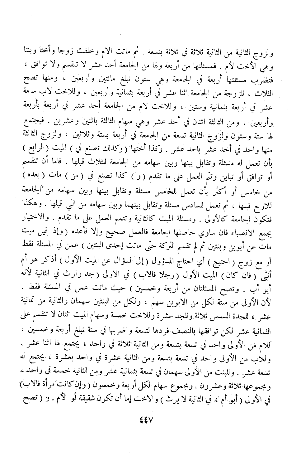 وَلِزَوْجِ الثَّانِيَةِ مِنْ الثَّانِيَةِ ثَلَاثَةٌ فِي ثَلَاثَةٍ بِتِسْعَةٍ ثُمَّ مَاتَتْ الْأُمُّ وَخَلَّفَتْ زَوْجًا وَأُخْتًا وَبِنْتًا وَهِيَ الْأُخْتُ لِأُمٍّ فَمَسْأَلَتُهَا مِنْ أَرْبَعَةٍ وَلَهَا مِنْ الْجَامِعَةِ أَحَدَ عَشَرَ لَا تَنْقَسِمُ وَلَا تُوَافِقُ، فَتَضْرِبُ مَسْأَلَتَهَا أَرْبَعَةً فِي الْجَامِعَةِ وَهِيَ سِتُّونَ تَبْلُغُ مِائَتَيْنِ وَأَرْبَعِينَ.