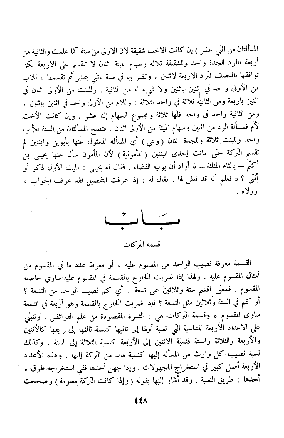 ِ الْقِسْمَةُ مَعْرِفَةُ نَصِيبِ الْوَاحِدِ مِنْ الْمَقْسُومِ عَلَيْهِ، أَوْ مَعْرِفَةُ عَدَدِ مَا فِي الْمَقْسُومِ مِنْ أَمْثَالِ الْمَقْسُومِ عَلَيْهِ وَلِهَذَا إذَا ضَرَبْتَ الْخَارِجَ بِالْقِسْمَةِ فِي الْمَقْسُومِ عَلَيْهِ سَاوَى حَاصِلُهُ الْمَقْسُومَ فَمَعْنَى اقْسِمْ سِتَّةً وَثَلَاثِينَ عَلَى تِسْعَةٍ، أَيْ كَمْ نَصِيبُ الْوَاحِدِ مِنْ التِّسْعَةِ؟ أَوْ كَمْ فِي السِّتَّةِ وَثَلَاثِينَ مِثْلُ التِّسْعَةِ؟ فَإِذَا ضَرَبْتَ الْخَارِجَ بِالْقِسْمَةِ وَهُوَ أَرْبَعَةٌ فِي التِّسْعَةِ سَاوَى الْمَقْسُومَ وَقِسْمَةُ التَّرِكَاتِ هِيَ: الثَّمَرَةُ الْمَقْصُودَةُ مِنْ عِلْمِ الْفَرَائِضِ.
