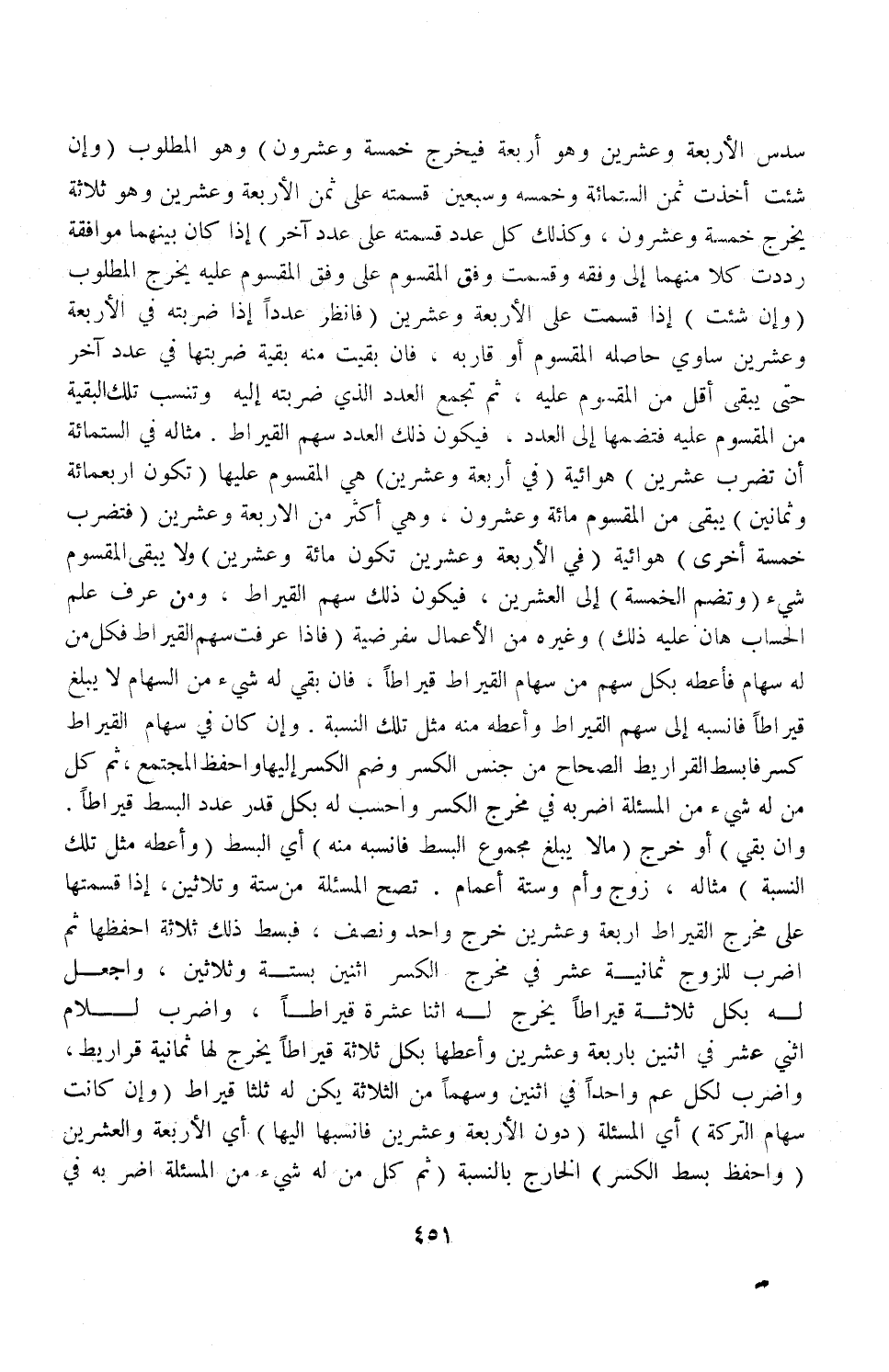 وَمَنْ عَرَفَ عِلْمَ الْحِسَابِ هَانَ عَلَيْهِ ذَلِكَ وَغَيْرُهُ مِنْ الْأَعْمَالِ الْفَرْضِيَّةِ (فَإِذَا عَرَفْتَ سَهْمَ الْقِيرَاطِ فَكُلُّ مَنْ لَهُ سِهَامٌ فَأَعْطِهِ بِكُلِّ سَهْمٍ مِنْ سِهَامِ الْقِيرَاطِ قِيرَاطًا، فَإِنْ بَقِيَ لَهُ شَيْءٌ مِنْ السِّهَامِ لَا يَبْلُغُ قِيرَاطًا فَانْسُبْهُ إلَى سَهْمِ الْقِيرَاطِ وَأَعْطِهِ مِنْهُ مِثْلَ تِلْكَ النِّسْبَةِ وَإِنْ كَانَ فِي سِهَامِ الْقِيرَاطِ كَسْرٌ فَابْسُطْ الْقَرَارِيطَ الصِّحَاحَ مِنْ جِنْسِ الْكَسْرِ وَضُمَّ إلَيْهَا الْكَسْرَ وَاحْفَظْ الْمُجْتَمِعَ، ثُمَّ كُلُّ مَنْ لَهُ شَيْءٌ مِنْ الْمَسْأَلَةِ اضْرِبْهُ فِي مَخْرَجِ الْكَسْرِ وَاحْسِبْ لَهُ بِكُلِّ قَدْرٍ عَدَدَ الْبَسْطِ قِيرَاطًا وَإِنْ بَقِيَ) .
