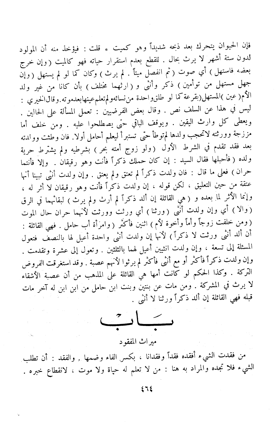 (بَابُ مِيرَاثِ الْمَفْقُودِ) مِنْ فَقَدْتُ الشَّيْءَ أَفْقِدُهُ فَقْدًا وَفُقْدَانًا، بِكَسْرِ الْفَاءِ وَضَمِّهَا وَالْفَقْدُ: أَنْ تَطْلُبَ الشَّيْءَ فَلَا تَجِدُهُ وَالْمُرَادُ بِهِ هُنَا مَنْ لَا تُعْلَمُ لَهُ حَيَاةٌ وَلَا مَوْتٌ، لَانْقِطَاعِ خَبَرِهِ