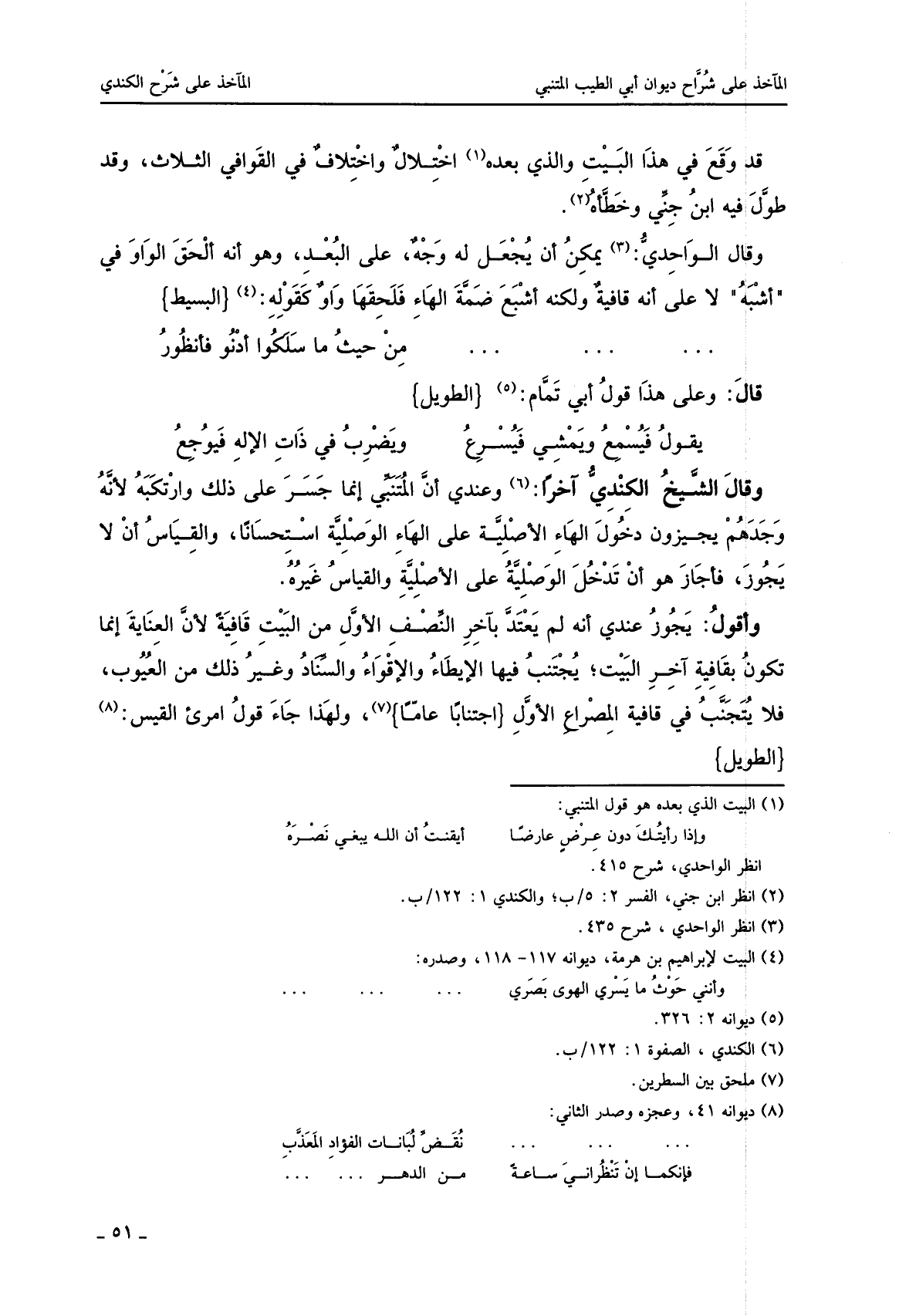 وقال الشيخ الكندي آخرا: وعندي أن المتنبي إنما جسر على ذلك وارتكبه لأنه وجدهم يجيزون دخول الهاء الأصلية على الهاء الوصلية استحسانا، والقياس أن لا يجوز، فأجاز هو أن تدخل الوصلية على الأصلية والقياس غيره.