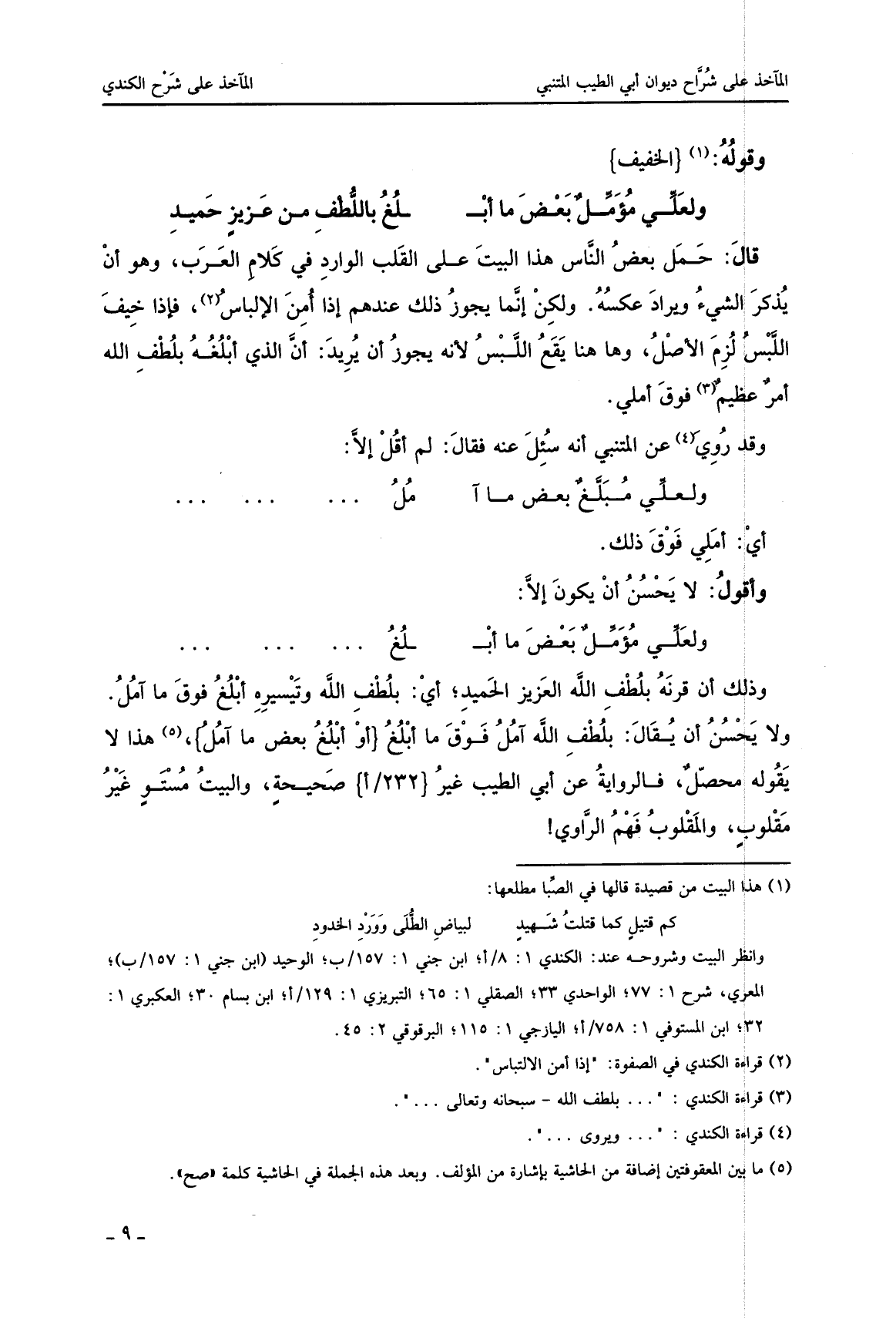 وذلك أن قرنه بلطف الله العزيز الحميد؛ أي: بلطف الله وتيسيره أبلغ فوق ما آمل. ولا يحسن أن يقال: بلطف الله أمل فوق ما ابلغ أو ابلغ بعض ما آمل، هذا لا يقوله محصل، فالرواية عن أبي الطيب غير صحيحة، والبيت مستو غير مقلوب، والمقلوب فهم الرواي!