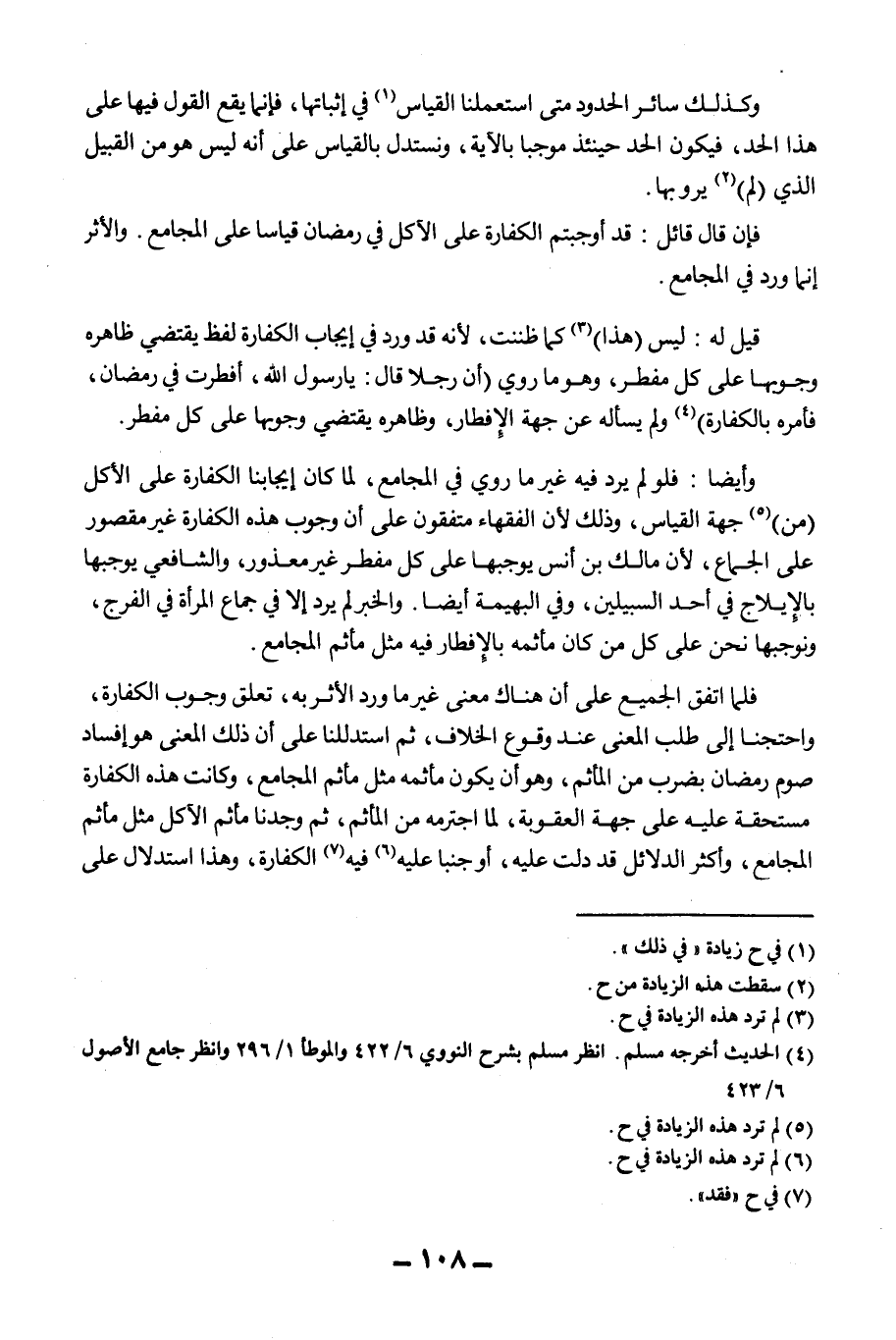 وَأَيْضًا: فَلَوْ لَمْ يَرِدْ فِيهِ غَيْرُ مَا رُوِيَ فِي الْمُجَامِعِ، لَمَا كَانَ إيجَابُنَا الْكَفَّارَةَ عَلَى الْأَكْلِ (مِنْ) جِهَةِ الْقِيَاسِ، وَذَلِكَ لِأَنَّ الْفُقَهَاءَ مُتَّفِقُونَ عَلَى أَنَّ وُجُوبَ هَذِهِ الْكَفَّارَةِ غَيْرُ مَقْصُورٍ عَلَى الْجِمَاعِ؛ لِأَنَّ مَالِكَ بْنَ أَنَسٍ يُوجِبُهَا عَلَى كُلِّ مُفْطِرٍ غَيْرِ مَعْذُورٍ، وَالشَّافِعِيَّ يُوجِبُهَا بِالْإِيلَاجِ فِي أَحَدِ السَّبِيلَيْنِ، وَفِي الْبَهِيمَةِ أَيْضًا. وَالْخَبَرُ لَمْ يَرِدْ إلَّا فِي جِمَاعِ الْمَرْأَةِ فِي الْفَرْجِ، وَنُوجِبُهَا نَحْنُ عَلَى كُلِّ مَنْ كَانَ مَأْثَمُهُ بِالْإِفْطَارِ فِيهِ مِثْلَ مَأْثَمِ الْمُجَامِعِ.