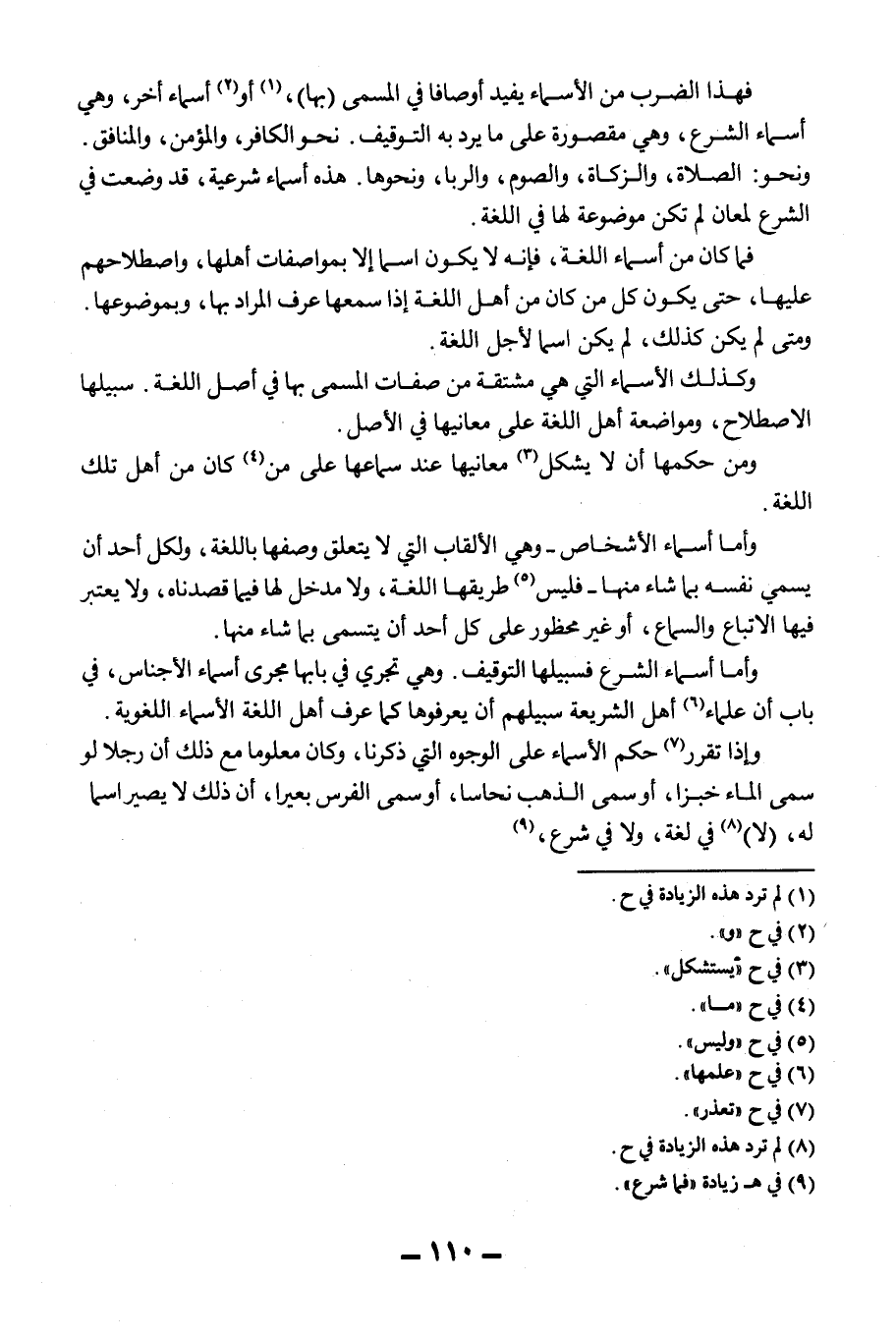 وَأَمَّا أَسْمَاءُ الشَّرْعِ فَسَبِيلُهَا التَّوْقِيفُ. وَهِيَ تَجْرِي فِي بَابِهَا مَجْرَى أَسْمَاءِ الْأَجْنَاسِ، فِي بَابِ أَنَّ عُلَمَاءَ أَهْلِ الشَّرِيعَةِ سَبِيلُهُمْ أَنْ يَعْرِفُوهَا كَمَا عَرَفَ أَهْلُ اللُّغَةِ الْأَسْمَاءَ اللُّغَوِيَّةَ.