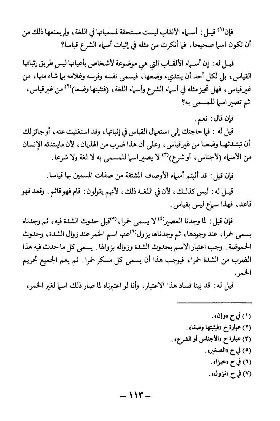 فَإِنْ قِيلَ: أَسْمَاءُ الْأَلْقَابِ لَيْسَتْ مُسْتَحَقَّةً لِمُسَمَّيَاتِهَا فِي اللُّغَةِ، وَلَمْ يَمْنَعْهَا ذَلِكَ مِنْ أَنْ تَكُونَ اسْمًا صَحِيحًا، فَمَا أَنْكَرْت مِنْ مِثْلِهِ فِي إثْبَاتِ أَسْمَاءِ الشَّرْعِ قِيَاسًا؟ قِيلَ لَهُ: إنَّ أَسْمَاءَ الْأَلْقَابِ الَّتِي هِيَ مَوْضُوعَةٌ لِأَشْخَاصٍ بِأَعْيَانِهَا لَيْسَ طَرِيقُ إثْبَاتِهَا الْقِيَاسَ، بَلْ لِكُلِّ أَحَدٍ أَنْ يَبْتَدِئَ وَضْعَهَا، فَيُسَمِّيَ نَفْسَهُ وَفَرَسَهُ وَغُلَامَهُ بِمَا شَاءَ مِنْهَا، مِنْ غَيْرٍ قِيَاسٍ، فَهَلْ تُجِيزُ مِثْلَهُ فِي أَسْمَاءِ الشَّرْعِ وَأَسْمَاءِ اللُّغَةِ، (فَتُثْبِتُهَا وَضْعًا) مِنْ غَيْرِ قِيَاسٍ، ثُمَّ تَصِيرُ اسْمًا لِلْمُسَمَّى بِهِ؟ فَإِنْ قَالَ: نَعَمْ.