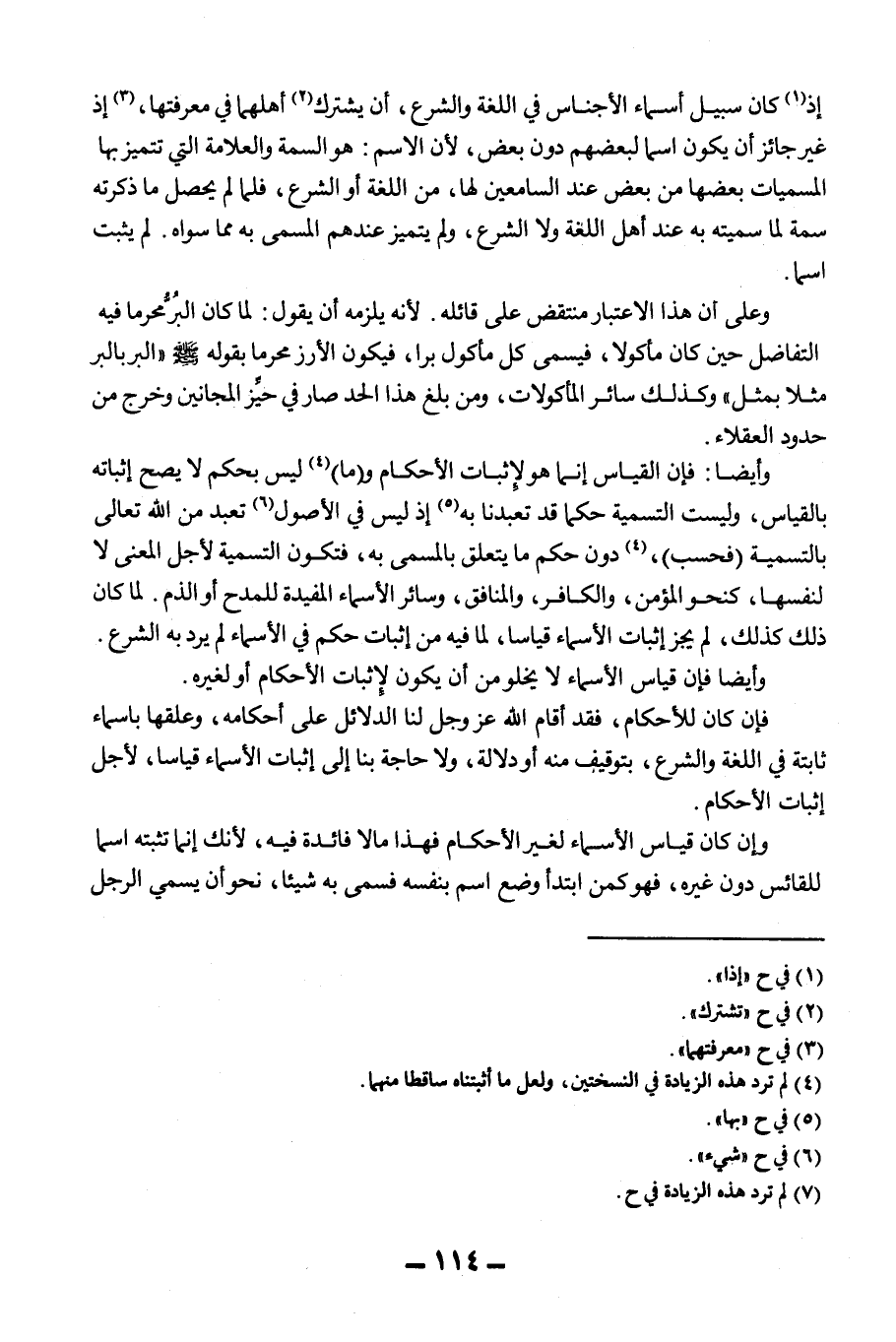 وَأَيْضًا: فَإِنَّ الْقِيَاسَ إنَّمَا هُوَ لِإِثْبَاتِ الْأَحْكَامِ وَ (مَا) لَيْسَ بِحُكْمٍ لَا يَصِحُّ إثْبَاتُهُ بِالْقِيَاسِ، وَلَيْسَتْ التَّسْمِيَةُ حُكْمًا قَدْ تَعَبَّدْنَا بِهِ إذْ لَيْسَ فِي الْأُصُولِ تَعَبُّدٌ مِنْ اللَّهِ تَعَالَى بِالتَّسْمِيَةِ (فَحَسْبُ) ، دُونَ حُكْمِ مَا يَتَعَلَّقُ بِالْمُسَمَّى بِهِ، فَتَكُونُ التَّسْمِيَةُ لِأَجْلِ الْمَعْنَى لَا لِنَفْسِهَا، كَنَحْوِ الْمُؤْمِنِ، وَالْكَافِرِ، وَالْمُنَافِقِ، وَسَائِرِ الْأَسْمَاءِ الْمُفِيدَةِ لِلْمَدْحِ، أَوْ الذَّمِّ. لَمَّا كَانَ ذَلِكَ كَذَلِكَ، لَمْ يَجُزْ إثْبَاتُ الْأَسْمَاءِ قِيَاسًا، لِمَا فِيهِ مِنْ إثْبَاتِ حُكْمٍ فِي الْأَسْمَاءِ لَمْ يَرِدْ بِهِ الشَّرْعُ.