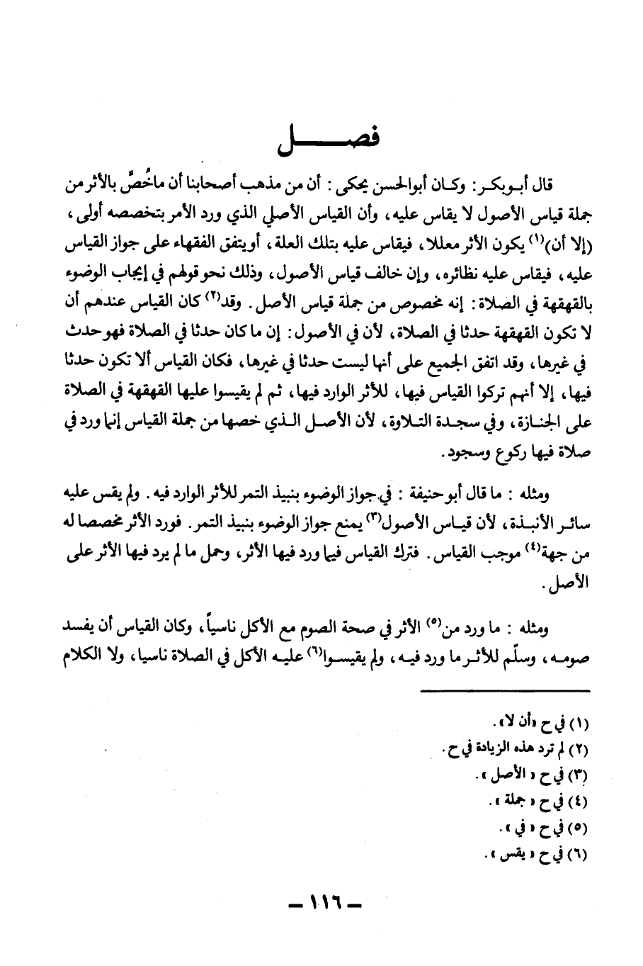 قَالَ أَبُو بَكْرٍ: وَكَانَ أَبُو الْحَسَنِ يَحْكِي: أَنَّ مِنْ مَذْهَبِ أَصْحَابِنَا أَنَّ مَا خُصَّ بِالْأَثَرِ مِنْ جُمْلَةِ قِيَاسِ الْأُصُولِ لَا يُقَاسُ عَلَيْهِ، وَأَنَّ الْقِيَاسَ الْأَصْلِيَّ الَّذِي وَرَدَ الْأَمْرُ بِتَخْصِيصِهِ أَوْلَى، (إلَّا أَنْ) يَكُونَ الْأَثَرُ مُعَلَّلًا، فَيُقَاسَ عَلَيْهِ بِتِلْكَ الْعِلَّةِ، أَوْ يَتَّفِقَ الْفُقَهَاءُ عَلَى جَوَازِ الْقِيَاسِ عَلَيْهِ، فَيُقَاسَ عَلَيْهِ نَظَائِرُهُ، وَإِنْ خَالَفَ قِيَاسَ الْأُصُولِ، وَذَلِكَ نَحْوُ قَوْلِهِمْ فِي إيجَابِ الْوُضُوءِ بِالْقَهْقَهَةِ فِي الصَّلَاةِ: إنَّهُ مَخْصُوصٌ مِنْ جُمْلَةِ قِيَاسِ الْأَصْلِ. وَقَدْ كَانَ الْقِيَاسُ عِنْدَهُمْ أَنْ لَا تَكُونَ الْقَهْقَهَةُ حَدَثًا فِي الصَّلَاةِ؛ لِأَنَّ فِي الْأُصُولِ: أَنَّ مَا كَانَ حَدَثًا فِي الصَّلَاةِ فَهُوَ حَدَثٌ فِي غَيْرِهَا، وَقَدْ اتَّفَقَ الْجَمِيعُ عَلَى أَنَّهَا لَيْسَتْ حَدَثًا فِي غَيْرِهَا، فَكَانَ الْقِيَاسُ أَلَّا تَكُونَ حَدَثًا فِيهَا، إلَّا أَنَّهُمْ تَرَكُوا الْقِيَاسَ فِيهَا، لِلْأَثَرِ الْوَارِدِ فِيهَا، ثُمَّ لَمْ يَقِيسُوا عَلَيْهَا الْقَهْقَهَةَ فِي الصَّلَاةِ عَلَى الْجِنَازَةِ، وَفِي سَجْدَةِ التِّلَاوَةِ؛ لِأَنَّ الْأَصْلَ الَّذِي خَصَّهَا مِنْ جُمْلَةِ الْقِيَاسِ إنَّمَا وَرَدَ فِي صَلَاةٍ فِيهَا رُكُوعٌ وَسُجُودٌ.
