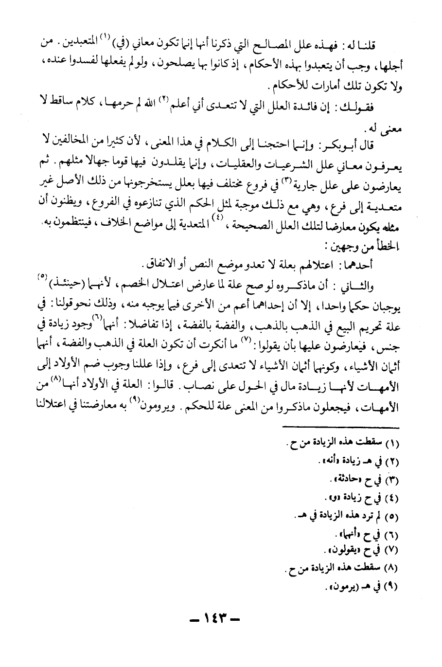 قَالَ أَبُو بَكْرٍ: وَإِنَّمَا احْتَجْنَا إلَى الْكَلَامِ فِي هَذَا الْمَعْنَى؛ لِأَنَّ كَثِيرًا مِنْ الْمُخَالِفِينَ لَا يَعْرِفُونَ مَعَانِيَ عِلَلِ الشَّرْعِيَّاتِ وَالْعَقْلِيَّاتِ، وَإِنَّمَا يُقَلِّدُونَ فِيهَا قَوْمًا جُهَّالًا مِثْلَهُمْ. ثُمَّ يُعَارِضُونَ عَلَى عِلَلٍ جَارِيَةٍ فِي فُرُوعٍ مُخْتَلَفٍ فِيهَا بِعِلَلٍ يَسْتَخْرِجُونَهَا مِنْ ذَلِكَ الْأَصْلِ غَيْرِ مُتَعَدِّيَةٍ إلَى فَرْعٍ، وَهِيَ مَعَ ذَلِكَ مُوجِبَةٌ لِمِثْلِ الْحُكْمِ الَّذِي تَنَازَعُوهُ فِي الْفُرُوعِ، وَيَظُنُّونَ أَنَّ مِثْلَهُ يَكُونُ مُعَارِضًا لِتِلْكَ الْعِلَلِ الصَّحِيحَةِ، الْمُتَعَدِّيَةِ إلَى مَوَاضِعِ الْخِلَافِ، فَيَنْتَظِمُونَ بِهِ الْخَطَأَ مِنْ وَجْهَيْنِ:
