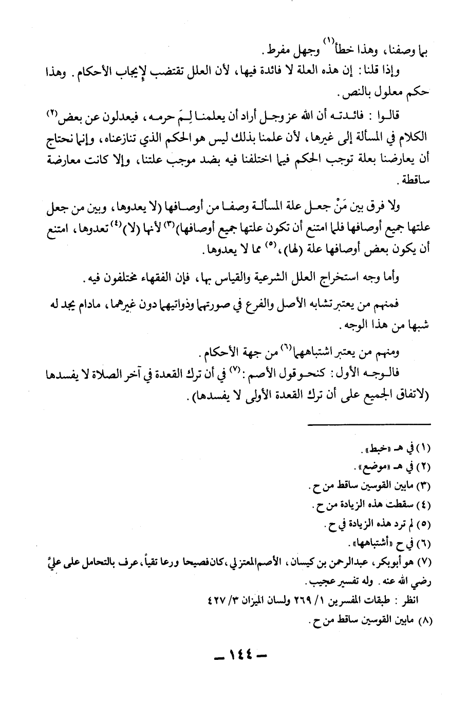 فَالْوَجْهُ الْأَوَّلُ: كَنَحْوِ قَوْلِ الْأَصَمِّ: فِي أَنَّ تَرْكَ الْقَعْدَةِ فِي آخِرِ الصَّلَاةِ لَا يُفْسِدُهَا (لِاتِّفَاقِ الْجَمِيعِ عَلَى أَنَّ تَرْكَ الْقَعْدَةِ الْأُولَى لَا يُفْسِدُهَا) .