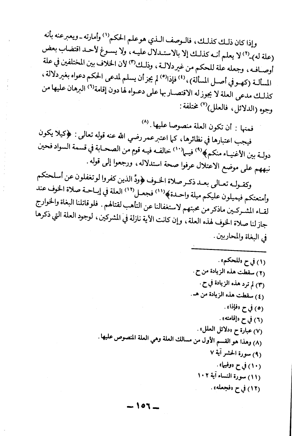 فَمِنْهَا: أَنْ تَكُونَ الْعِلَّةُ مَنْصُوصًا عَلَيْهَا. فَيَجِبَ اعْتِبَارُهَا فِي نَظَائِرِهَا، كَمَا اعْتَبَرَ عُمَرُ - رَضِيَ اللَّهُ عَنْهُ - قَوْله تَعَالَى: {كَيْ لَا يَكُونَ دُولَةً بَيْنَ الْأَغْنِيَاءِ مِنْكُمْ} [الحشر: 7] فِيمَا خَالَفَهُ فِيهِ قَوْمٌ مِنْ الصَّحَابَةِ فِي قِسْمَةِ السَّوَادِ فَحِينَ نَبَّهَهُمْ عَلَى مَوْضِعِ الِاعْتِلَالِ عَرَفُوا صِحَّةَ اسْتِدْلَالِهِ، وَرَجَعُوا إلَى قَوْلِهِ.