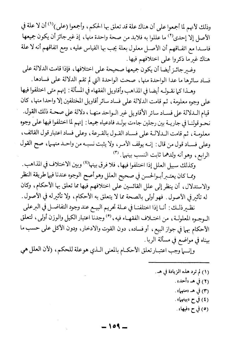 وَذَلِكَ لِأَنَّهُمْ لَمَّا أَجْمَعُوا عَلَى أَنَّ هُنَاكَ عِلَّةً قَدْ تَعَلَّقَ بِهَا الْحُكْمُ، وَأَجْمَعُوا (عَلَى) أَنْ لَا عِلَّةَ فِي الْأَصْلِ إلَّا إحْدَى مَا عَلَّلُوا بِهِ فَلَا بُدَّ مِنْ صِحَّةِ وَاحِدَةٍ مِنْهَا؛ إذْ غَيْرُ جَائِزٍ أَنْ يَكُونَ جَمِيعُهَا فَاسِدًا مَعَ اتِّفَاقِهِمْ أَنَّ الْأَصْلَ مَعْلُولٌ بِعِلَّةٍ يَجِبُ بِهَا الْقِيَاسُ عَلَيْهِ، وَمَعَ اتِّفَاقِهِمْ أَنَّهُ لَا عِلَّةَ هُنَاكَ غَيْرُ مَا ذَكَرُوا عَلَى اخْتِلَافِهِمْ فِيهَا.