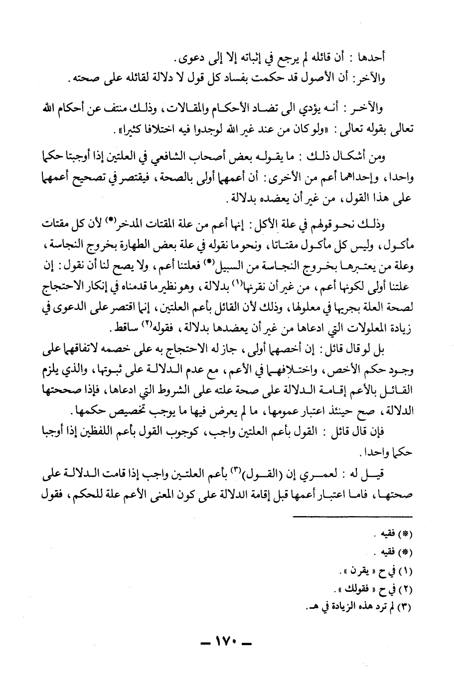 وَذَلِكَ نَحْوُ قَوْلِهِمْ فِي عِلَّةِ الْأَكْلِ: إنَّهَا أَعَمُّ مِنْ عِلَّةِ الْمُقْتَاتِ الْمُدَّخَرِ لِأَنَّ كُلَّ مُقْتَاتٍ مَأْكُولٌ، وَلَيْسَ كُلُّ مَأْكُولٍ مُقْتَاتًا، وَنَحْوُ مَا نَقُولُهُ فِي عِلَّةِ بَعْضِ الطَّهَارَةِ بِخُرُوجِ النَّجَاسَةِ، وَعِلَّةِ مَنْ يَعْتَبِرُهَا بِخُرُوجِ النَّجَاسَةِ مِنْ السَّبِيلِ فَعِلَّتُنَا أَعَمُّ، وَلَا يَصِحُّ لَنَا أَنْ نَقُولَ: إنَّ عِلَّتَنَا أَوْلَى لِكَوْنِهَا أَعَمَّ، مِنْ غَيْرِ أَنْ نَقْرُنَهَا بِدَلَالَةٍ، وَهُوَ نَظِيرُ مَا قَدَّمْنَاهُ فِي إنْكَارِ الِاحْتِجَاجِ لِصِحَّةِ الْعِلَّةِ بِجَرْيِهَا فِي مَعْلُولِهَا، وَذَلِكَ؛ لِأَنَّ الْقَائِلَ بِأَعَمِّ الْعِلَّتَيْنِ، إنَّمَا اقْتَصَرَ عَلَى الدَّعْوَى فِي زِيَادَةِ الْمَعْلُولَاتِ الَّتِي ادَّعَاهَا مِنْ غَيْرِ أَنْ يُعَضِّدَهَا بِدَلَالَةٍ، فَقَوْلُهُ سَاقِطٌ.