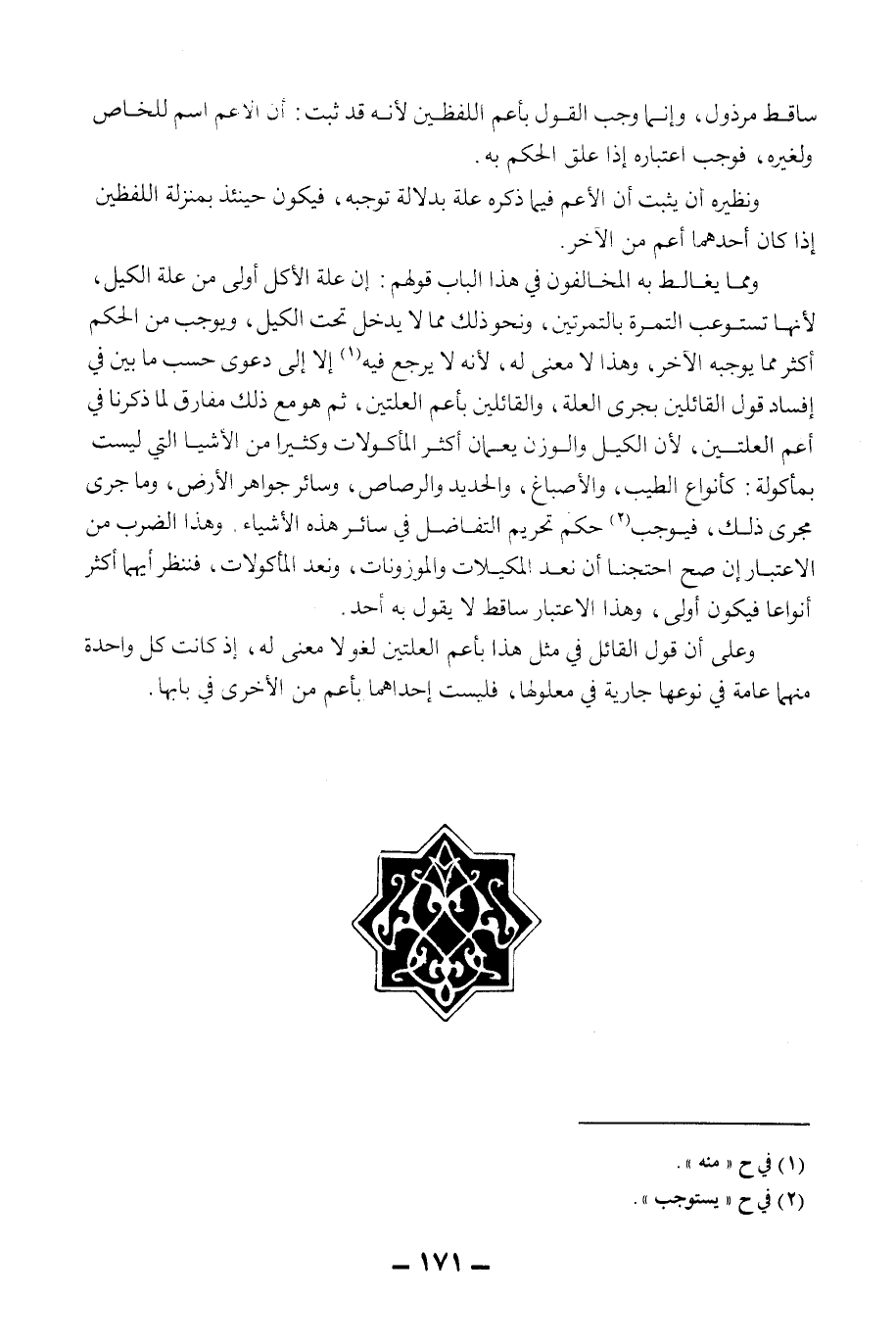وَعَلَى أَنَّ قَوْلَ الْقَائِلِ فِي مِثْلِ هَذَا بِأَعَمِّ الْعِلَّتَيْنِ لَغْوٌ لَا مَعْنَى لَهُ؛ إذْ كَانَتْ كُلُّ وَاحِدَةٍ مِنْهُمَا عَامَّةً فِي نَوْعِهَا جَارِيَةً فِي مَعْلُولِهَا، فَلَيْسَتْ إحْدَاهُمَا بِأَعَمَّ مِنْ الْأُخْرَى فِي بَابِهَا.