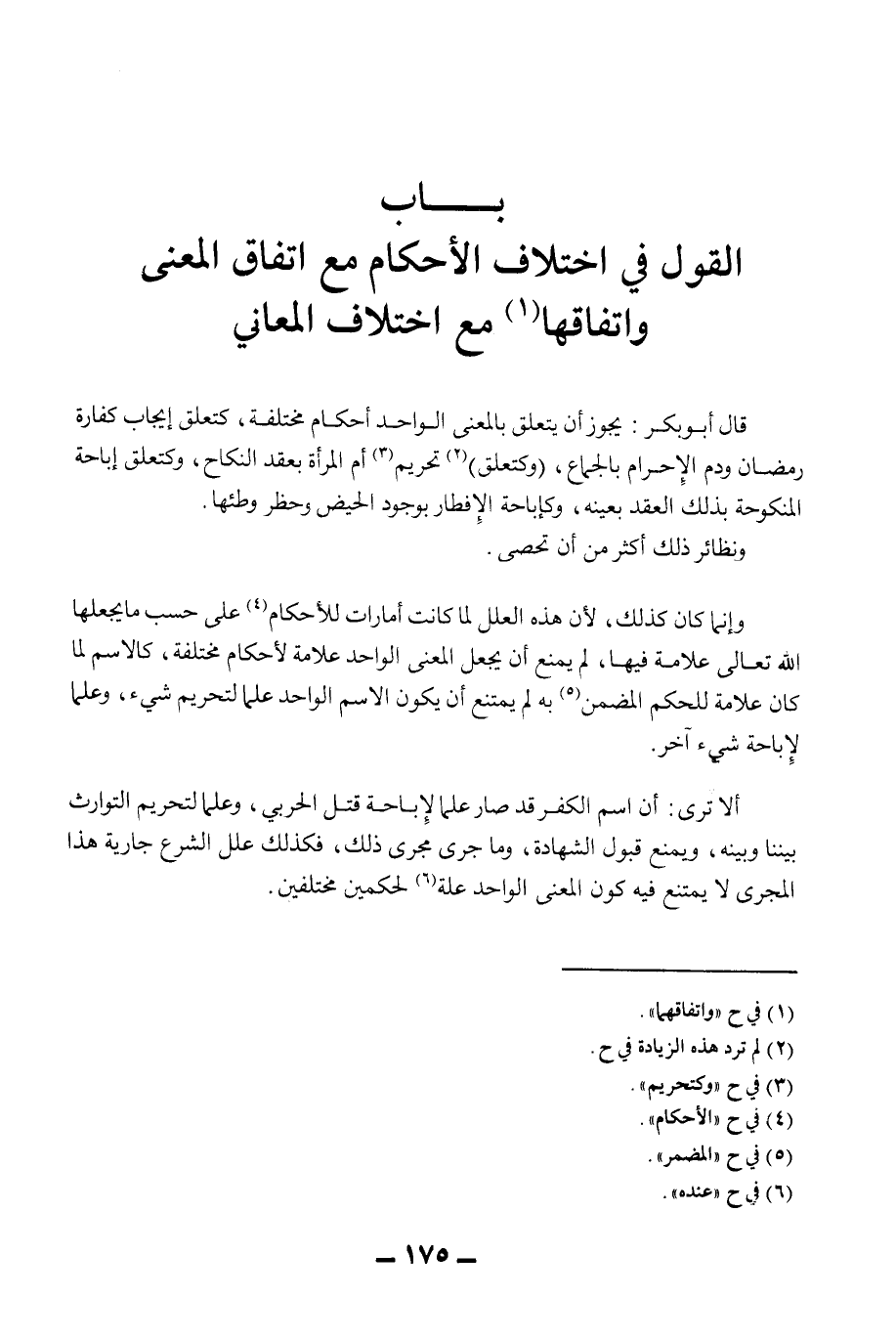 قَالَ أَبُو بَكْرٍ: يَجُوزُ أَنْ يَتَعَلَّقَ بِالْمَعْنَى الْوَاحِدِ أَحْكَامٌ مُخْتَلِفَةٌ، كَتَعَلُّقِ إيجَابِ كَفَّارَةِ رَمَضَانَ وَدَمِ الْإِحْرَامِ بِالْجِمَاعِ، (وَكَتَعَلُّقِ) تَحْرِيمِ أُمِّ الْمَرْأَةِ بِعَقْدِ النِّكَاحِ، وَكَتَعَلُّقِ إبَاحَةِ الْمَنْكُوحَةِ بِذَلِكَ الْعَقْدِ بِعَيْنِهِ، وَكَإِبَاحَةِ الْإِفْطَارِ بِوُجُودِ الْحَيْضِ وَحَظْرِ وَطْئِهَا.