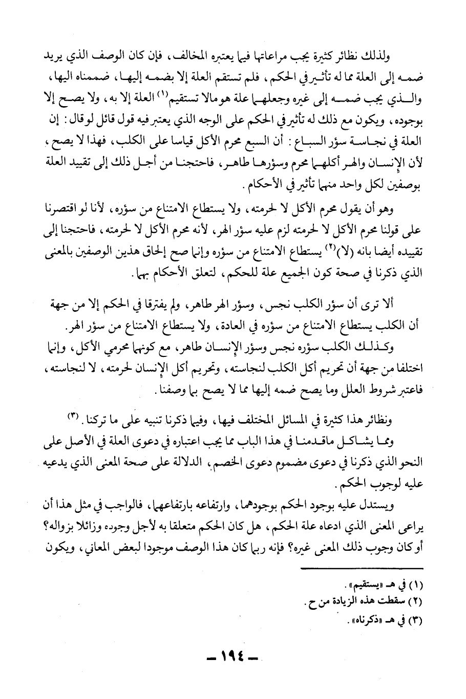 وَلِذَلِكَ نَظَائِرُ كَثِيرَةٌ يَجِبُ مُرَاعَاتُهَا فِيمَا يَعْتَبِرُهُ الْمُخَالِفُ، فَإِنْ كَانَ الْوَصْفُ الَّذِي يُرِيدُ ضَمَّهُ إلَى الْعِلَّةِ مِمَّا لَهُ تَأْثِيرٌ فِي الْحُكْمِ، فَلَمْ تَسْتَقِمْ الْعِلَّةُ إلَّا بِضَمِّهِ إلَيْهَا، ضَمَمْنَاهُ إلَيْهَا، وَاَلَّذِي يَجِبُ ضَمُّهُ إلَى غَيْرِهِ وَجَعْلُهُمَا عِلَّةً هُوَ مَا لَا تَسْتَقِيمُ الْعِلَّةُ إلَّا بِهِ، وَلَا يَصِحُّ إلَّا بِوُجُودِهِ، وَيَكُونُ مَعَ ذَلِكَ لَهُ تَأْثِيرٌ فِي الْحُكْمِ عَلَى الْوَجْهِ الَّذِي يُعْتَبَرُ فِيهِ قَوْلُ قَائِلٍ لَوْ قَالَ: إنَّ الْعِلَّةَ فِي نَجَاسَةِ سُؤْرِ السِّبَاعِ: أَنَّ السَّبُعَ مُحَرَّمُ الْأَكْلِ قِيَاسًا عَلَى الْكَلْبِ، فَهَذَا لَا يَصِحُّ؛ لِأَنَّ الْإِنْسَانَ وَالْهِرَّ أَكْلُهُمَا مُحَرَّمٌ وَسُؤْرُهُمَا طَاهِرٌ، فَاحْتَجْنَا مِنْ أَجْلِ ذَلِكَ إلَى تَقْيِيدِ الْعِلَّةِ بِوَصْفَيْنِ لِكُلِّ وَاحِدٍ مِنْهُمَا تَأْثِيرٌ فِي الْأَحْكَامِ.