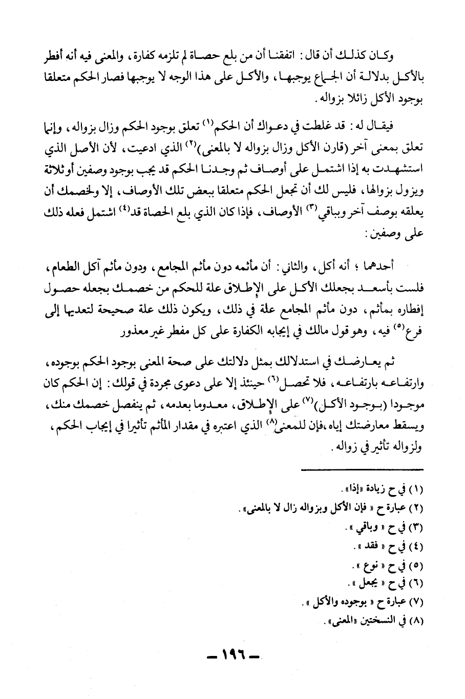 أَحَدُهُمَا؛ أَنَّهُ أَكَلَ، وَالثَّانِي: أَنَّ مَأْثَمَهُ دُونَ مَأْثَمِ الْمُجَامِعِ، وَدُونَ مَأْثَمِ آكِلِ الطَّعَامِ، فَلَسْتَ بِأَسْعَدَ بِجَعْلِك الْأَكْلَ عَلَى الْإِطْلَاقِ عِلَّةً لِلْحُكْمِ مِنْ خَصْمِك بِجَعْلِهِ حُصُولَ إفْطَارِهِ بِمَأْثَمٍ، دُونَ مَأْثَمِ الْمُجَامِعِ عِلَّةً فِي ذَلِكَ، وَيَكُونُ ذَلِكَ عِلَّةً صَحِيحَةً لِتَعَدِّيهَا إلَى فَرْعٍ فِيهِ، وَهُوَ قَوْلُ مَالِكٍ فِي إيجَابِهِ الْكَفَّارَةَ عَلَى كُلِّ مُفْطِرٍ غَيْرِ مَعْذُورٍ، ثُمَّ يُعَارِضُك فِي اسْتِدْلَالِك بِمِثْلِ دَلَالَتِك عَلَى صِحَّةِ الْمَعْنَى بِوُجُودِ الْحُكْمِ بِوُجُودِهِ، وَارْتِفَاعِهِ بِارْتِفَاعِهِ، فَلَا تَحْصُلُ حِينَئِذٍ إلَّا عَلَى دَعْوَى مُجَرَّدَةٍ فِي قَوْلِك: إنَّ الْحُكْمَ كَانَ مَوْجُودًا (بِوُجُودِ الْأَكْلِ) عَلَى الْإِطْلَاقِ، مَعْدُومًا بِعَدَمِهِ، ثُمَّ يَنْفَصِلُ خَصْمُك مِنْك، وَيُسْقِطُ مُعَارَضَتَك إيَّاهُ، فَإِنَّ لِلْمَعْنَى الَّذِي اعْتَبَرَهُ فِي مِقْدَارِ الْمَأْثَمِ تَأْثِيرًا فِي إيجَابِ الْحُكْمِ، وَلِزَوَالِهِ تَأْثِيرٌ فِي زَوَالِهِ.