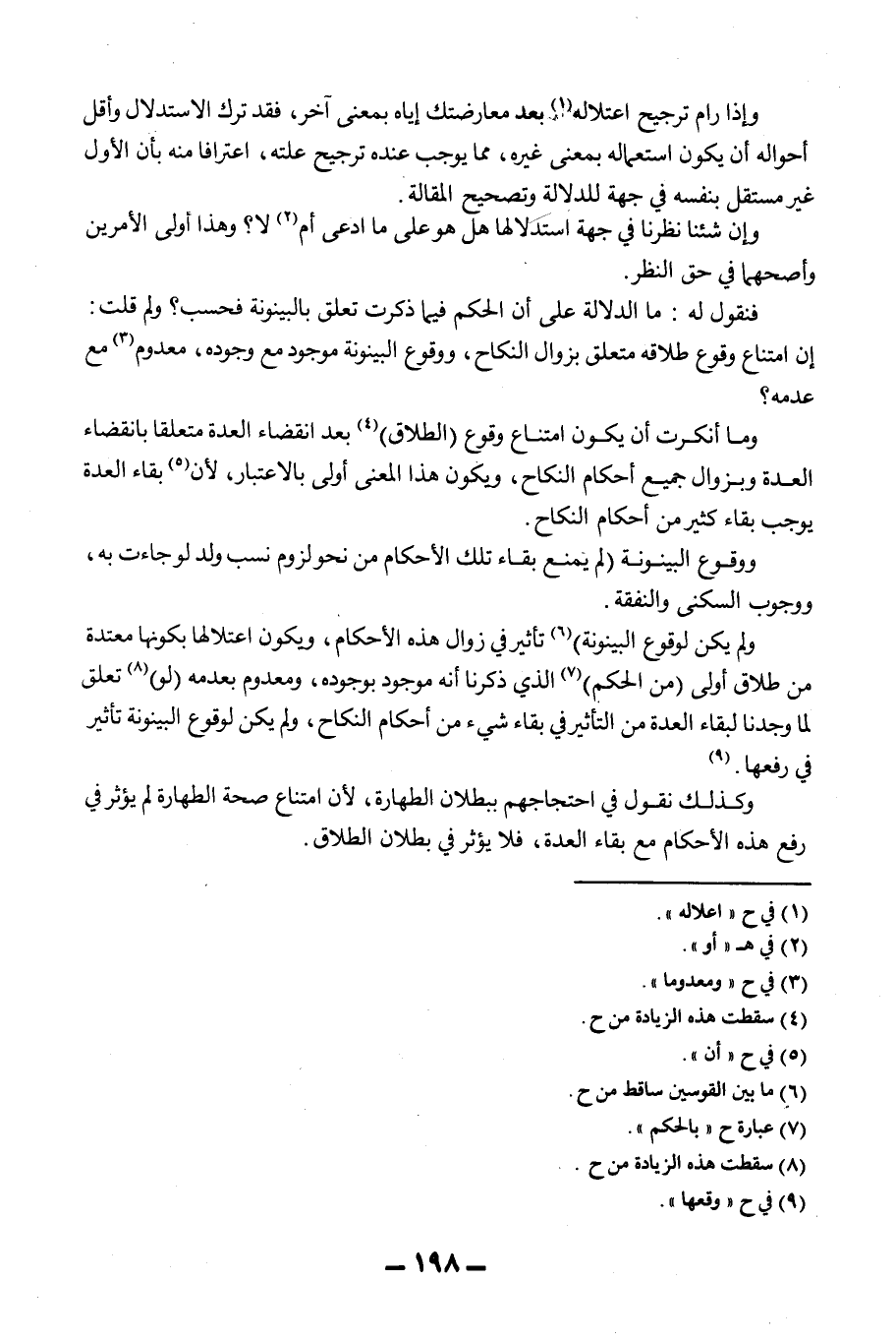 فَنَقُولُ لَهُ: مَا الدَّلَالَةُ عَلَى أَنَّ الْحُكْمَ فِيمَا ذَكَرْت تَعَلَّقَ بِالْبَيْنُونَةِ فَحَسْبُ؟ وَلِمَ قُلْت: إنَّ امْتِنَاعَ وُقُوعِ طَلَاقِهِ مُتَعَلِّقٌ بِزَوَالِ النِّكَاحِ، وَوُقُوعَ الْبَيْنُونَةِ مَوْجُودٌ مَعَ وُجُودِهِ، مَعْدُومٌ مَعَ عَدَمِهِ؟ وَمَا أَنْكَرْت أَنْ يَكُونَ امْتِنَاعُ وُقُوعِ (الطَّلَاقِ) بَعْدَ انْقِضَاءِ الْعِدَّةِ مُتَعَلِّقًا بِانْقِضَاءِ الْعِدَّةِ وَبِزَوَالِ جَمِيعِ أَحْكَامِ النِّكَاحِ، وَيَكُونَ هَذَا الْمَعْنَى أَوْلَى بِالِاعْتِبَارِ؛ لِأَنَّ بَقَاءَ الْعِدَّةِ يُوجِبُ بَقَاءَ كَثِيرٍ مِنْ أَحْكَامِ النِّكَاحِ.