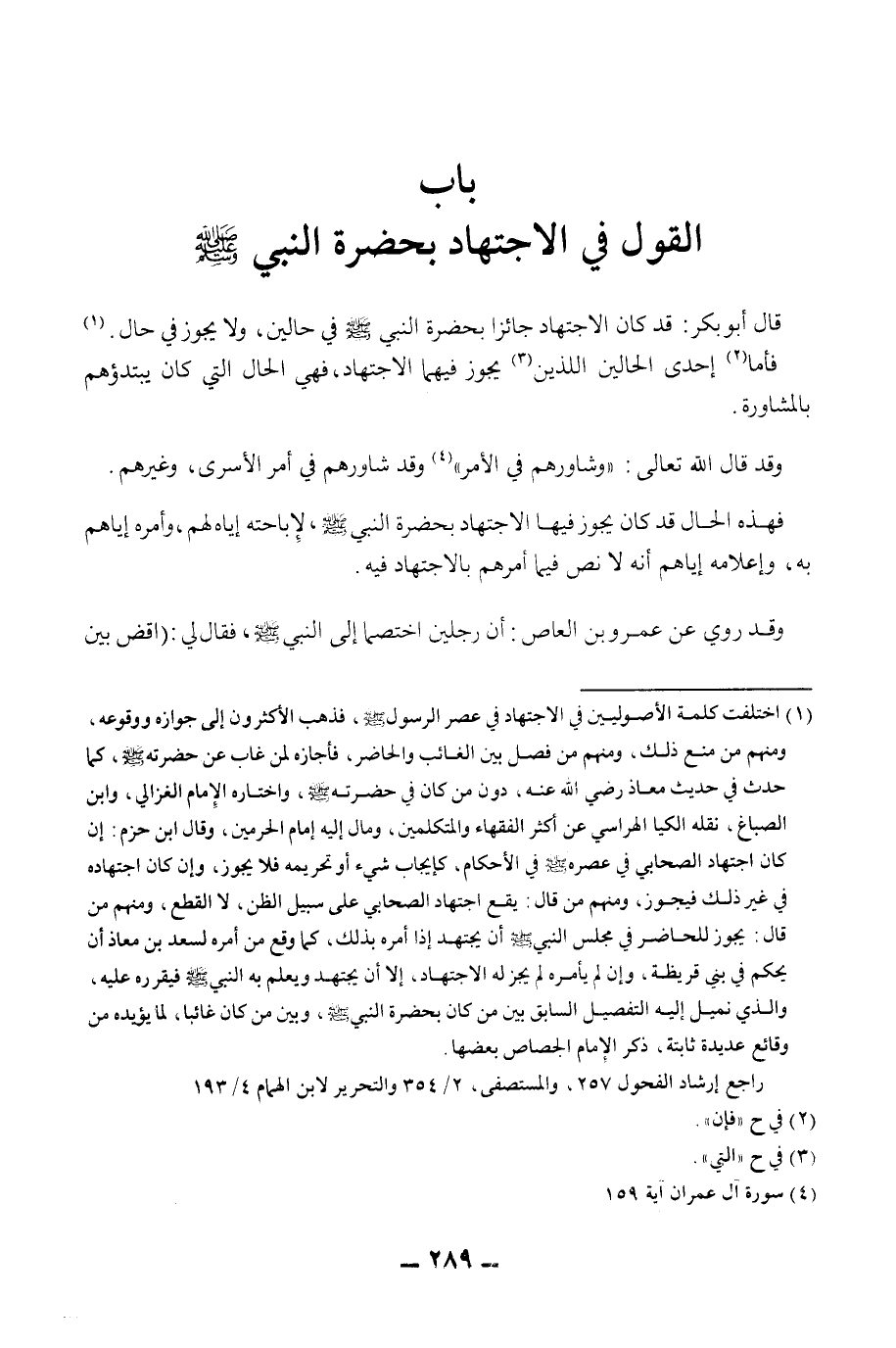 ِّ - صَلَّى اللَّهُ عَلَيْهِ وَسَلَّمَ - قَالَ أَبُو بَكْرٍ: قَدْ كَانَ الِاجْتِهَادُ جَائِزًا بِحَضْرَةِ النَّبِيِّ - صَلَّى اللَّهُ عَلَيْهِ وَسَلَّمَ - فِي حَالَيْنِ، وَلَا يَجُوزُ فِي حَالٍ. فَأَمَّا إحْدَى الْحَالَيْنِ اللَّذَيْنِ يَجُوزُ فِيهِمَا الِاجْتِهَادُ، فَهِيَ الْحَالُ الَّتِي كَانَ يَبْتَدِئُهُمْ بِالْمُشَاوَرَةِ. وَقَدْ قَالَ اللَّهُ تَعَالَى: {وَشَاوِرْهُمْ فِي الْأَمْرِ} [آل عمران: 159] وَقَدْ شَاوَرَهُمْ فِي أَمْرِ الْأَسْرَى، وَغَيْرِهِمْ. فَهَذِهِ الْحَالُ قَدْ كَانَ يَجُوزُ فِيهَا الِاجْتِهَادُ بِحَضْرَةِ النَّبِيِّ - صَلَّى اللَّهُ عَلَيْهِ وَسَلَّمَ -، لِإِبَاحَتِهِ إيَّاهُ لَهُمْ، وَأَمْرِهِ إيَّاهُمْ بِهِ، وَإِعْلَامِهِ إيَّاهُمْ أَنَّهُ لَا نَصَّ فِيمَا أَمَرَهُمْ بِالِاجْتِهَادِ فِيهِ. وَقَدْ رُوِيَ عَنْ عَمْرِو بْنِ الْعَاصِ: «أَنَّ رَجُلَيْنِ اخْتَصَمَا إلَى النَّبِيِّ - صَلَّى اللَّهُ عَلَيْهِ وَسَلَّمَ - فَقَالَ لِي: اقْضِ بَيْنَ