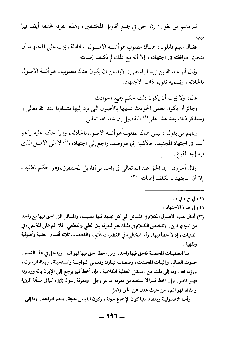 ثُمَّ مِنْهُمْ مَنْ يَقُولُ: إنَّ الْحَقَّ فِي جَمِيعِ أَقَاوِيلِ الْمُخْتَلِفِينَ، وَهَذِهِ الْفِرْقَةُ مُخْتَلِفَةٌ أَيْضًا فِيمَا بَيْنَهَا. فَقَالَ مِنْهُمْ قَائِلُونَ: هُنَاكَ مَطْلُوبٌ هُوَ أَشْبَهُ الْأُصُولِ بِالْحَادِثَةِ، يَجِبُ عَلَى الْمُجْتَهِدِ أَنْ يَتَحَرَّى مُوَافَقَتَهُ فِي اجْتِهَادِهِ، إلَّا أَنَّهُ مَعَ ذَلِكَ لَمْ يُكَلَّفَ إصَابَتَهُ. وَقَالَ أَبُو عَبْدِ اللَّهِ بْنُ زَيْدِ الْوَاسِطِيُّ: لَا بُدَّ مِنْ أَنْ يَكُونَ هُنَاكَ مَطْلُوبٌ، هُوَ أَشْبَهُ الْأُصُولِ بِالْحَادِثَةِ، وَنُسَمِّيه تَقْوِيمَ ذَاتِ الِاجْتِهَادِ. قَالَ: وَلَا يَجِبُ أَنْ يَكُونَ ذَلِكَ حُكْمُ جَمِيعِ الْحَوَادِثِ. وَجَائِزٌ أَنْ يَكُونَ بَعْضُ الْحَوَادِثِ شَبَّهَهَا بِالْأُصُولِ الَّتِي يَرُدُّ إلَيْهَا مُتَسَاوِيًا عِنْدَ اللَّهِ تَعَالَى، وَسَنَذْكُرُ ذَلِكَ بَعْدَ هَذَا عَلَى التَّفْصِيلِ إنْ شَاءَ اللَّهُ تَعَالَى. وَمِنْهُمْ مَنْ يَقُولُ: لَيْسَ هُنَاكَ مَطْلُوبٌ هُوَ أَشْبَهُ الْأُصُولِ بِالْحَادِثَةِ، وَإِنَّمَا الْحُكْمُ عَلَيْهِ بِمَا هُوَ أَشْبَهُ فِي اجْتِهَادِ الْمُجْتَهِدِ، فَالْأَشْبَهُ إنَّمَا هُوَ وَصْفٌ رَاجِعٌ إلَى اجْتِهَادِهِ، لَا إلَى الْأَصْلِ الَّذِي يُرَدُّ إلَيْهِ الْفَرْعُ.