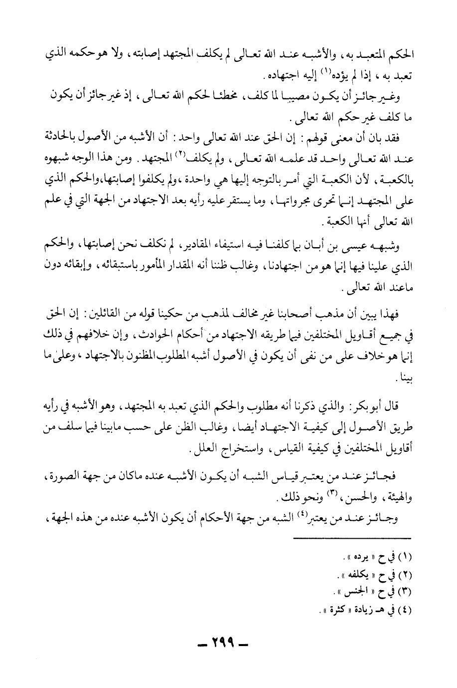 وَغَيْرُ جَائِزٍ أَنْ يَكُونَ مُصِيبًا لِمَا كُلِّفَ، مُخْطِئًا لِحُكْمِ اللَّهِ تَعَالَى، إذْ غَيْرُ جَائِزٍ أَنْ يَكُونَ مَا كُلِّفَ غَيْرَ حُكْمِ اللَّهِ تَعَالَى. فَقَدْ بَانَ أَنَّ مَعْنَى قَوْلِهِمْ: إنَّ الْحَقَّ عِنْدَ اللَّهِ تَعَالَى وَاحِدٌ: أَنَّ الْأَشْبَهَ مِنْ الْأُصُولِ بِالْحَادِثَةِ عِنْدَ اللَّهِ تَعَالَى وَاحِدٌ قَدْ عَلِمَهُ اللَّهُ تَعَالَى، وَلَمْ يُكَلِّفْ الْمُجْتَهِدَ. وَمِنْ هَذَا الْوَجْهِ شَبَّهُوهُ بِالْكَعْبَةِ، لِأَنَّ الْكَعْبَةَ الَّتِي أَمَرَ بِالتَّوَجُّهِ إلَيْهَا هِيَ وَاحِدَةٌ، وَلَمْ يُكَلَّفُوا إصَابَتَهَا، وَالْحُكْمُ الَّذِي عَلَى الْمُجْتَهِدِ إنَّمَا تَحَرِّي مَجْرَوَاتُهَا، وَمَا يَسْتَقِرُّ عَلَيْهِ رَأْيُهُ بَعْدَ الِاجْتِهَادِ مِنْ الْجِهَةِ الَّتِي فِي عِلْمِ اللَّهِ تَعَالَى أَنَّهَا الْكَعْبَةُ. وَشَبَّهَهُ عِيسَى بْنُ أَبَانَ بِمَا كُلِّفْنَا فِيهِ اسْتِيفَاءَ الْمَقَادِيرِ، لَمْ نُكَلَّفْ نَحْنُ إصَابَتَهَا، وَالْحُكْمَ الَّذِي عَلَيْنَا فِيهَا إنَّمَا هُوَ مِنْ اجْتِهَادِنَا، وَغَالِبِ ظَنِّنَا أَنَّهُ الْمِقْدَارُ الْمَأْمُورُ بِاسْتِبْقَائِهِ، وَإِبْقَائِهِ دُونَ مَا عِنْدَ اللَّهِ تَعَالَى. فَهَذَا يُبَيِّنُ أَنَّ مَذْهَبَ أَصْحَابِنَا غَيْرُ مُخَالِفٍ لِمَذْهَبِ مَنْ حَكَيْنَا قَوْلَهُ مِنْ الْقَائِلِينَ: إنَّ الْحَقَّ فِي جَمِيعِ أَقَاوِيلِ الْمُخْتَلِفِينَ فِيمَا طَرِيقُهُ الِاجْتِهَادُ مِنْ أَحْكَامِ الْحَوَادِثِ، وَإِنَّ خِلَافَهُمْ فِي ذَلِكَ إنَّمَا هُوَ خِلَافٌ عَلَى مَنْ نَفَى أَنْ يَكُونَ فِي الْأُصُولِ أَشْبَهُ الْمَطْلُوبِ الْمَظْنُونِ بِالِاجْتِهَادِ، وَعَلَى مَا بَيَّنَّا. قَالَ أَبُو بَكْرٍ: وَاَلَّذِي ذَكَرْنَا أَنَّهُ مَطْلُوبٌ وَالْحُكْمُ الَّذِي تَعَبَّدَ بِهِ الْمُجْتَهِدُ، وَهُوَ الْأَشْبَهُ فِي رَأْيِهِ طَرِيقُ الْأُصُولِ إلَى كَيْفِيَّةِ الِاجْتِهَادِ أَيْضًا، وَغَالِبُ الظَّنِّ عَلَى حَسَبِ مَا بَيَّنَّا فِيمَا سَلَفَ مِنْ أَقَاوِيلِ الْمُخْتَلِفِينَ فِي كَيْفِيَّةِ الْقِيَاسِ، وَاسْتِخْرَاجِ الْعِلَلِ. فَجَائِزٌ عِنْدَ مَنْ يَعْتَبِرُ قِيَاسَ الشَّبَهِ أَنْ يَكُونَ الْأَشْبَهُ عِنْدَهُ مَا كَانَ مِنْ جِهَةِ الصُّورَةِ، وَالْهَيْئَةِ، وَالْحُسْنِ، وَنَحْوِ ذَلِكَ.
