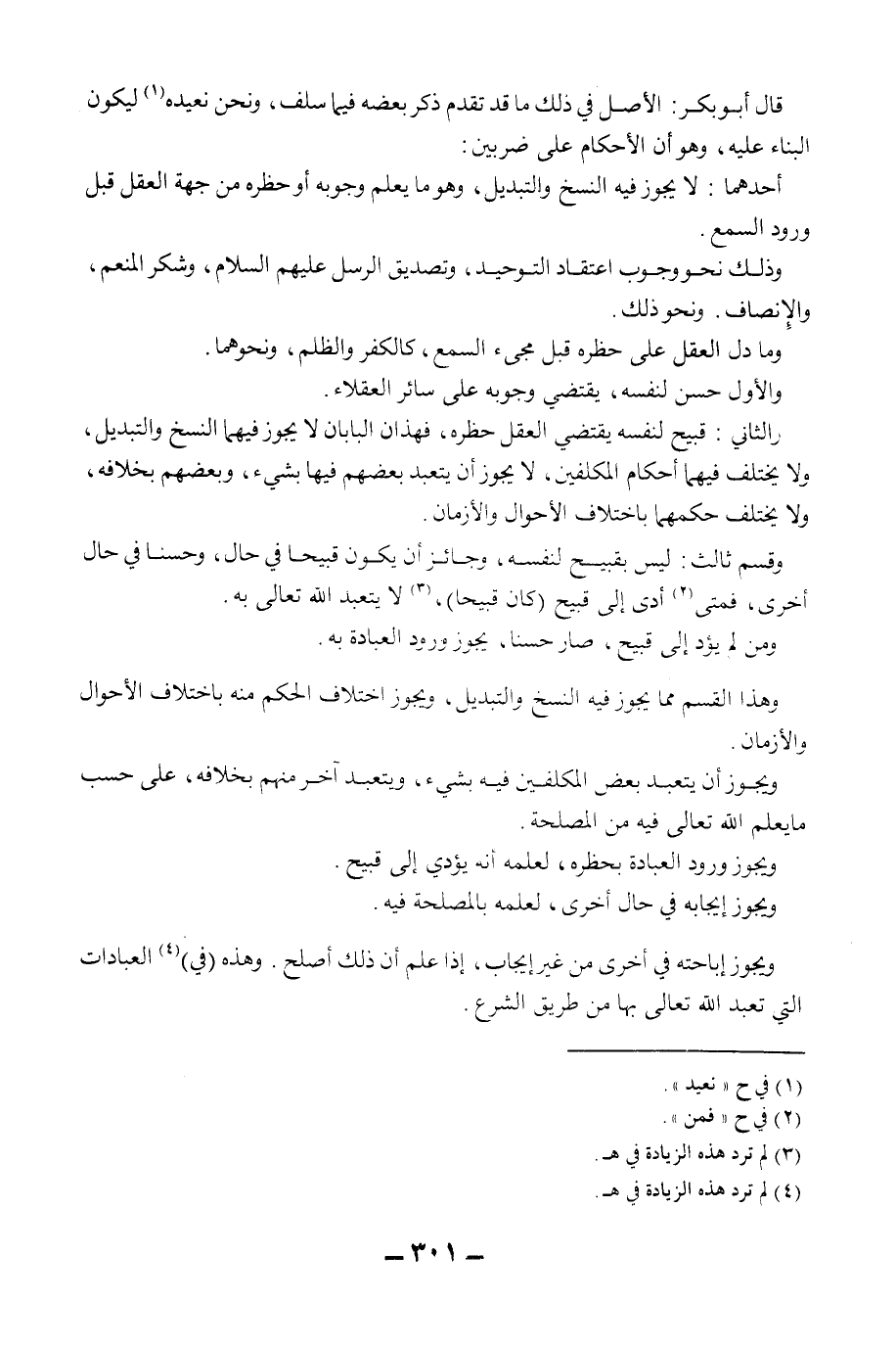 وَالثَّانِي: قَبِيحٌ لِنَفْسِهِ يَقْتَضِي الْعَقْلُ حَظْرَهُ، فَهَذَانِ الْبَابَانِ لَا يَجُوزُ فِيهِمَا النَّسْخُ وَالتَّبْدِيلُ، وَلَا يَخْتَلِفُ فِيهِمَا أَحْكَامُ الْمُكَلَّفِينَ، لَا يَجُوزُ أَنْ يَتَعَبَّدَ بَعْضُهُمْ فِيهَا بِشَيْءٍ، وَبَعْضُهُمْ بِخِلَافِهِ، وَلَا يَخْتَلِفُ حُكْمُهُمَا بِاخْتِلَافِ الْأَحْوَالِ وَالْأَزْمَانِ. وَقِسْمٌ ثَالِثٌ: لَيْسَ بِقَبِيحٍ لِنَفْسِهِ، وَجَائِزٌ أَنْ يَكُونَ قَبِيحًا فِي حَالٍ، وَحَسَنًا فِي حَالٍ أُخْرَى، فَمَتَى أَدَّى إلَى قَبِيحٍ (كَانَ قَبِيحًا) ، لَا يُتَعَبَّدُ اللَّهُ تَعَالَى بِهِ. وَمَتَى لَمْ يُؤَدِّ إلَى قَبِيحٍ، صَارَ حَسَنًا، يَجُوزُ وُرُودُ الْعِبَادَةِ بِهِ. وَهَذَا الْقِسْمُ مِمَّا يَجُوزُ فِيهِ النَّسْخُ وَالتَّبْدِيلُ، وَيَجُوزُ اخْتِلَافُ الْحُكْمِ مِنْهُ بِاخْتِلَافِ الْأَحْوَالِ وَالْأَزْمَانِ. وَيَجُوزُ أَنْ يَتَعَبَّدَ بَعْضُ الْمُكَلَّفِينَ فِيهِ بِشَيْءٍ، وَيَتَعَبَّدَ آخَرُ مِنْهُمْ بِخِلَافِهِ، عَلَى حَسَبِ مَا يَعْلَمُ اللَّهُ تَعَالَى فِيهِ مِنْ الْمَصْلَحَةِ. وَيَجُوزُ وُرُودُ الْعِبَادَةِ بِحَظْرِهِ، لِعِلْمِهِ أَنَّهُ يُؤَدِّي إلَى قَبِيحٍ. وَيَجُوزُ إيجَابُهُ فِي حَالٍ أُخْرَى، لِعِلْمِهِ بِالْمَصْلَحَةِ فِيهِ. وَيَجُوزُ إبَاحَتُهُ فِي أُخْرَى مِنْ غَيْرِ إيجَابٍ، إذَا عَلِمَ أَنَّ ذَلِكَ أَصْلَحُ. وَهَذِهِ (فِي) الْعِبَادَاتِ الَّتِي يُعْبَدُ اللَّهُ تَعَالَى بِهَا مِنْ طَرِيقِ الشَّرْعِ.