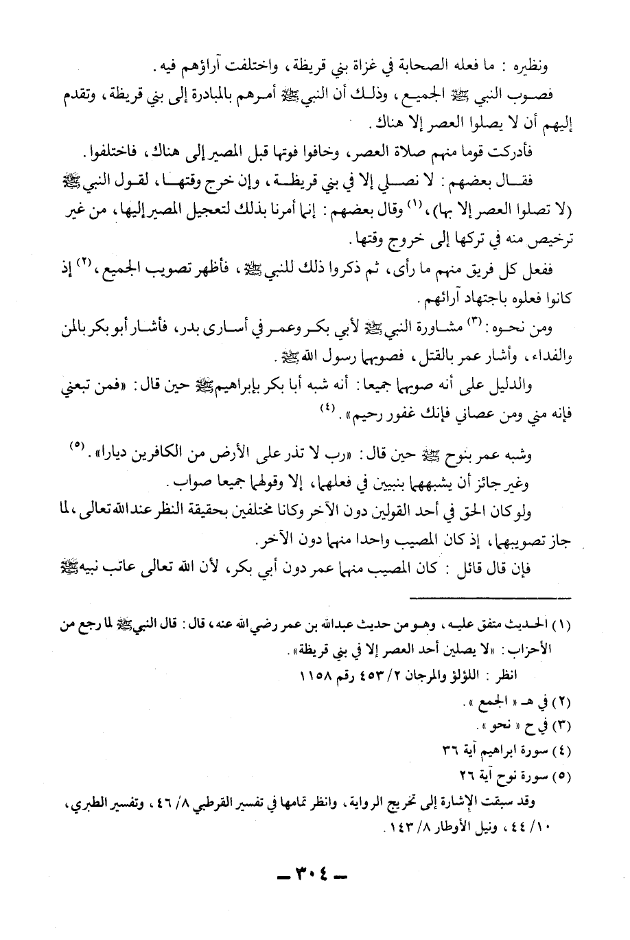 وَنَظِيرُهُ: مَا فَعَلَهُ الصَّحَابَةُ فِي غُزَاةِ بَنِي قُرَيْظَةَ، وَاخْتَلَفَتْ آرَاؤُهُمْ فِيهِ. فَصَوَّبَ النَّبِيُّ - صَلَّى اللَّهُ عَلَيْهِ وَسَلَّمَ - الْجَمِيعَ، وَذَلِكَ «أَنَّ النَّبِيَّ - صَلَّى اللَّهُ عَلَيْهِ وَسَلَّمَ - أَمَرَهُمْ بِالْمُبَادَرَةِ إلَى بَنِي قُرَيْظَةَ، وَتَقَدَّمَ إلَيْهِمْ أَنْ لَا يُصَلُّوا الْعَصْرَ إلَّا هُنَاكَ» . فَأَدْرَكَتْ قَوْمًا مِنْهُمْ صَلَاةُ الْعَصْرِ، وَخَافُوا فَوْتَهَا قَبْلَ الْمَصِيرِ إلَى هُنَاكَ، فَاخْتَلَفُوا. فَقَالَ بَعْضُهُمْ: لَا نُصَلِّي إلَّا فِي بَنِي قُرَيْظَةَ، وَإِنْ خَرَجَ وَقْتُهَا، لِقَوْلِ النَّبِيِّ - صَلَّى اللَّهُ عَلَيْهِ وَسَلَّمَ - «لَا تُصَلُّوا الْعَصْرَ إلَّا بِهَا» ، وَقَالَ بَعْضُهُمْ: إنَّمَا أَمَرَنَا بِذَلِكَ لِتَعْجِيلِ الْمَصِيرِ إلَيْهَا، مِنْ غَيْرِ تَرْخِيصٍ مِنْهُ فِي تَرْكِهَا إلَى خُرُوجِ وَقْتِهَا. فَفَعَلَ كُلُّ فَرِيقٍ مِنْهُمْ مَا رَأَى، ثُمَّ ذَكَرُوا ذَلِكَ لِلنَّبِيِّ - صَلَّى اللَّهُ عَلَيْهِ وَسَلَّمَ - فَأَظْهَرَ تَصْوِيبَ الْجَمِيعِ، إذْ كَانُوا فَعَلُوهُ بِاجْتِهَادِ آرَائِهِمْ.