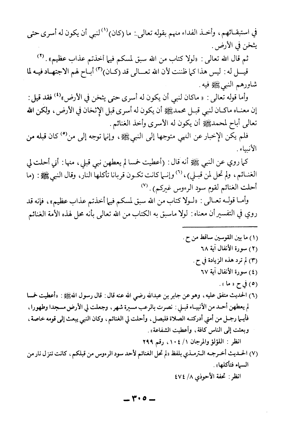 كَمَا رُوِيَ عَنْ النَّبِيِّ - صَلَّى اللَّهُ عَلَيْهِ وَسَلَّمَ - أَنَّهُ قَالَ: «أُعْطِيت خَمْسًا لَمْ يُعْطَهُنَّ نَبِيٌّ قَبْلِي، مِنْهَا: أَنِّي أُحِلَّتْ لِي الْغَنَائِمُ، وَلَمْ تَحِلَّ لِمَنْ قَبْلِي» ، وَإِنَّمَا كَانَتْ تَكُونُ قُرْبَانًا تَأْكُلُهَا النَّارُ، وَقَالَ النَّبِيُّ - صَلَّى اللَّهُ عَلَيْهِ وَسَلَّمَ -: «مَا أُحِلَّتْ الْغَنَائِمُ لِقَوْمٍ سُودِ الرُّءُوسِ غَيْرِكُمْ» . وَأَمَّا قَوْله تَعَالَى: {لَوْلَا كِتَابٌ مِنْ اللَّهِ سَبَقَ لَمَسَّكُمْ فِيمَا أَخَذْتُمْ عَذَابٌ عَظِيمٌ} [الأنفال: 68] ، فَإِنَّهُ قَدْ رُوِيَ فِي التَّفْسِيرِ أَنَّ مَعْنَاهُ: لَوْلَا مَا سَبَقَ بِهِ الْكِتَابُ مِنْ اللَّهِ تَعَالَى بِأَنَّهُ مُحِلٌّ لِهَذِهِ الْأُمَّةِ الْغَنَائِمَ