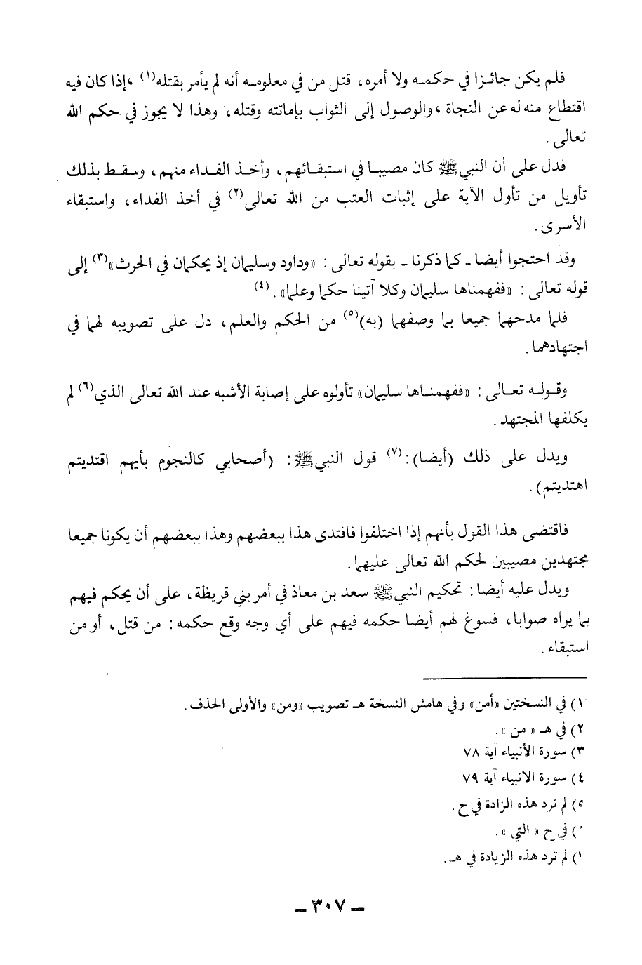 فَلَمْ يَكُنْ جَائِرًا فِي حُكْمِهِ وَلَا أَمْرِهِ، قَتَلَ مَنْ فِي مَعْلُومِهِ أَنَّهُ لَمْ يَأْمُرْ بِقَتْلِهِ، إذَا كَانَ فِيهِ اقْتِطَاعٌ مِنْهُ لَهُ عَنْ النَّجَاةِ، وَالْوُصُولِ إلَى الثَّوَابِ بِإِمَاتَتِهِ وَقَتْلِهِ، وَهَذَا لَا يَجُوزُ فِي حُكْمِ اللَّهِ تَعَالَى. فَدَلَّ عَلَى أَنَّ النَّبِيَّ - صَلَّى اللَّهُ عَلَيْهِ وَسَلَّمَ - كَانَ مُصِيبًا فِي اسْتِبْقَائِهِمْ، وَأَخْذِ الْفِدَاءِ مِنْهُمْ، وَسَقَطَ بِذَلِكَ تَأْوِيلُ مَنْ تَأَوَّلَ الْآيَةَ عَلَى إثْبَاتِ الْعَتْبِ مِنْ اللَّهِ تَعَالَى فِي أَخْذِ الْفِدَاءِ، وَاسْتِبْقَاءِ الْأَسْرَى. وَقَدْ احْتَجُّوا أَيْضًا - كَمَا ذَكَرْنَا - بِقَوْلِهِ تَعَالَى: {وَدَاوُد وَسُلَيْمَانَ إذْ يَحْكُمَانِ فِي الْحَرْثِ} [الأنبياء: 78] إلَى قَوْله تَعَالَى: {فَفَهَّمْنَاهَا سُلَيْمَانَ وَكُلًّا آتَيْنَا حُكْمًا وَعِلْمًا} [الأنبياء: 79] . فَلَمَّا مَدَحَهُمَا جَمِيعًا بِمَا وَصَفَهُمَا (بِهِ) مِنْ الْحُكْمِ وَالْعِلْمِ، دَلَّ عَلَى تَصْوِيبِهِ لَهُمَا فِي اجْتِهَادِهِمَا. وقَوْله تَعَالَى: {فَفَهَّمْنَاهَا سُلَيْمَانَ} [الأنبياء: 79] تَأَوَّلُوهُ عَلَى إصَابَةِ الْأَشْبَهِ عِنْدَ اللَّهِ تَعَالَى الَّذِي لَمْ يُكَلِّفْهَا الْمُجْتَهِدَ. وَيَدُلُّ عَلَى ذَلِكَ (أَيْضًا) : قَوْلُ النَّبِيِّ - صَلَّى اللَّهُ عَلَيْهِ وَسَلَّمَ -: «أَصْحَابِي كَالنُّجُومِ بِأَيِّهِمْ اقْتَدَيْتُمْ اهْتَدَيْتُمْ» . فَاقْتَضَى هَذَا الْقَوْلُ بِأَنَّهُمْ إذَا اخْتَلَفُوا فَاقْتَدَى هَذَا بِبَعْضِهِمْ وَهَذَا بِبَعْضِهِمْ أَنْ يَكُونَا جَمِيعًا مُجْتَهِدِينَ مُصِيبِينَ لِحُكْمِ اللَّهِ تَعَالَى عَلَيْهِمَا. وَيَدُلُّ عَلَيْهِ أَيْضًا: «تَحْكِيمُ النَّبِيِّ - صَلَّى اللَّهُ عَلَيْهِ وَسَلَّمَ - سَعْدَ بْنَ مُعَاذٍ فِي أَمْرِ بَنِي قُرَيْظَةَ، عَلَى أَنْ يَحْكُمَ فِيهِمْ بِمَا يَرَاهُ صَوَابًا» ، فَسَوَّغَ لَهُمْ أَيْضًا حُكْمَهُ فِيهِمْ عَلَى أَيِّ وَجْهٍ وَقَعَ حُكْمُهُ: مِنْ قَتْلٍ، أَوْ مِنْ اسْتِبْقَاءٍ.