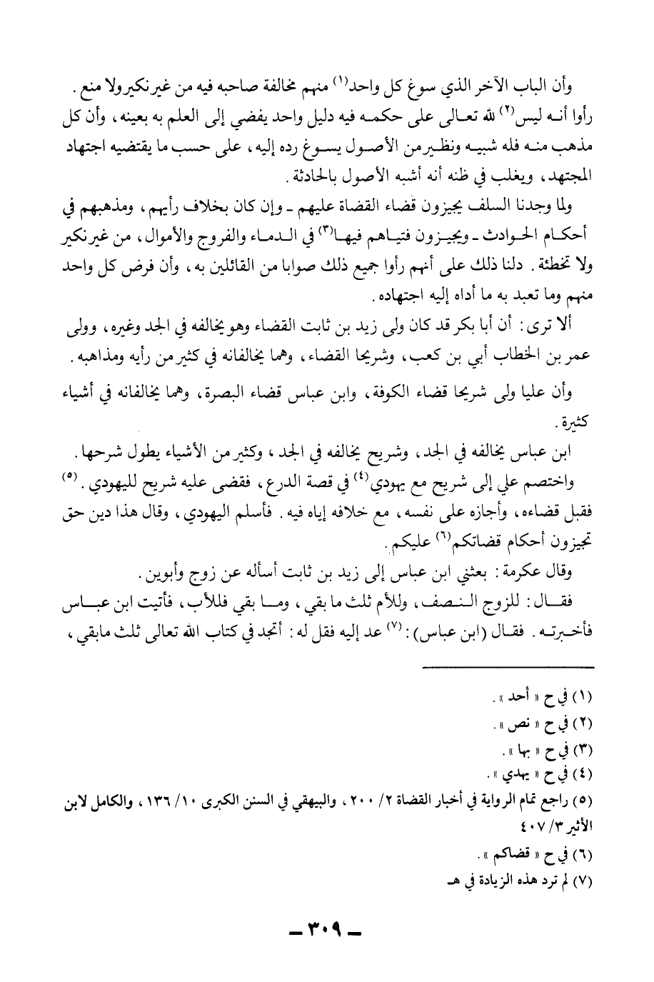 وَأَنَّ الْبَابَ الْآخَرَ الَّذِي سَوَّغَ كُلُّ وَاحِدٍ مِنْهُمْ مُخَالَفَةَ صَاحِبِهِ فِيهِ مِنْ غَيْرِ نَكِيرٍ وَلَا مَنْعٍ. رَأَوْا أَنَّهُ لَيْسَ لِلَّهِ تَعَالَى عَلَى حُكْمِهِ فِيهِ دَلِيلٌ وَاحِدٌ يُفْضِي إلَى الْعِلْمِ بِهِ بِعَيْنِهِ، وَأَنَّ كُلَّ مَذْهَبٍ مِنْهُ فَلَهُ شَبِيهٌ وَنَظِيرٌ مِنْ الْأُصُولِ يُسَوَّغُ رَدُّهُ إلَيْهِ، عَلَى حَسَبِ مَا يَقْتَضِيهِ اجْتِهَادُ الْمُجْتَهِدِ، وَيَغْلِبُ فِي ظَنِّهِ أَنَّهُ أَشْبَهُ الْأُصُولِ بِالْحَادِثَةِ. وَلَمَّا وَجَدْنَا السَّلَفَ يُجِيزُونَ قَضَاءَ الْقُضَاةِ عَلَيْهِمْ - وَإِنْ كَانَ بِخِلَافِ رَأْيِهِمْ، وَمَذْهَبِهِمْ فِي أَحْكَامِ الْحَوَادِثِ - وَيُجِيزُونَ فُتْيَاهُمْ فِيهَا فِي الدِّمَاءِ وَالْفُرُوجِ وَالْأَمْوَالِ، مِنْ غَيْرِ نَكِيرٍ وَلَا تَخْطِئَةٍ. دَلَّنَا ذَلِكَ عَلَى أَنَّهُمْ رَأَوْا جَمِيعَ ذَلِكَ صَوَابًا مِنْ الْقَائِلِينَ بِهِ، وَأَنَّ فَرْضَ كُلِّ وَاحِدٍ مِنْهُمْ وَمَا تَعَبَّدَ بِهِ مَا أَدَّاهُ إلَيْهِ اجْتِهَادُهُ. أَلَا تَرَى: أَنَّ أَبَا بَكْرٍ قَدْ كَانَ وَلَّى زَيْدَ بْنَ ثَابِتٍ الْقَضَاءَ وَهُوَ يُخَالِفُهُ فِي الْجَدِّ وَغَيْرِهِ، وَوَلَّى عُمَرُ بْنُ الْخَطَّابِ أُبَيَّ بْنَ كَعْبٍ، وَشُرَيْحًا الْقَضَاءَ، وَهُمَا يُخَالِفَانِهِ فِي كَثِيرٍ مِنْ رَأْيِهِ وَمَذَاهِبِهِ. وَأَنَّ عَلِيًّا وَلَّى شُرَيْحًا قَضَاءَ الْكُوفَةِ، وَابْنَ عَبَّاسٍ قَضَاءَ الْبَصْرَةِ، وَهُمَا يُخَالِفَانِهِ فِي أَشْيَاءَ كَثِيرَةٍ. ابْنُ عَبَّاسٍ يُخَالِفُهُ فِي الْجَدِّ، وَشُرَيْحٌ يُخَالِفُهُ فِي الْجَدِّ، وَكَثِيرٌ مِنْ الْأَشْيَاءِ يَطُولُ شَرْحُهَا. وَاخْتَصَمَ عَلِيٌّ إلَى شُرَيْحٍ مَعَ يَهُودِيٍّ فِي قِصَّةِ الدِّرْعِ، فَقَضَى عَلَيْهِ شُرَيْحٌ لِلْيَهُودِيِّ. فَقَبِلَ قَضَاءَهُ، وَأَجَازَهُ عَلَى نَفْسِهِ، مَعَ خِلَافِهِ إيَّاهُ فِيهِ. فَأَسْلَمَ الْيَهُودِيُّ، وَقَالَ هَذَا دِينٌ حَقٌّ تُجِيزُونَ أَحْكَامَ قُضَاتِكُمْ عَلَيْكُمْ. وَقَالَ عِكْرِمَةُ: بَعَثَنِي ابْنُ عَبَّاسٍ إلَى زَيْدِ بْنِ ثَابِتٍ أَسْأَلُهُ عَنْ زَوْجٍ وَأَبَوَيْنِ. فَقَالَ: لِلزَّوْجِ النِّصْفُ، وَلِلْأُمِّ ثُلُثُ مَا بَقِيَ، وَمَا بَقِيَ فَلِلْأَبِ، فَأَتَيْت ابْنَ عَبَّاسٍ فَأَخْبَرْته. فَقَالَ (ابْنُ عَبَّاسٍ) : عُدْ إلَيْهِ فَقُلْ لَهُ: أَتَجِدُ فِي كِتَابِ اللَّهِ تَعَالَى ثُلُثَ مَا بَقِيَ،