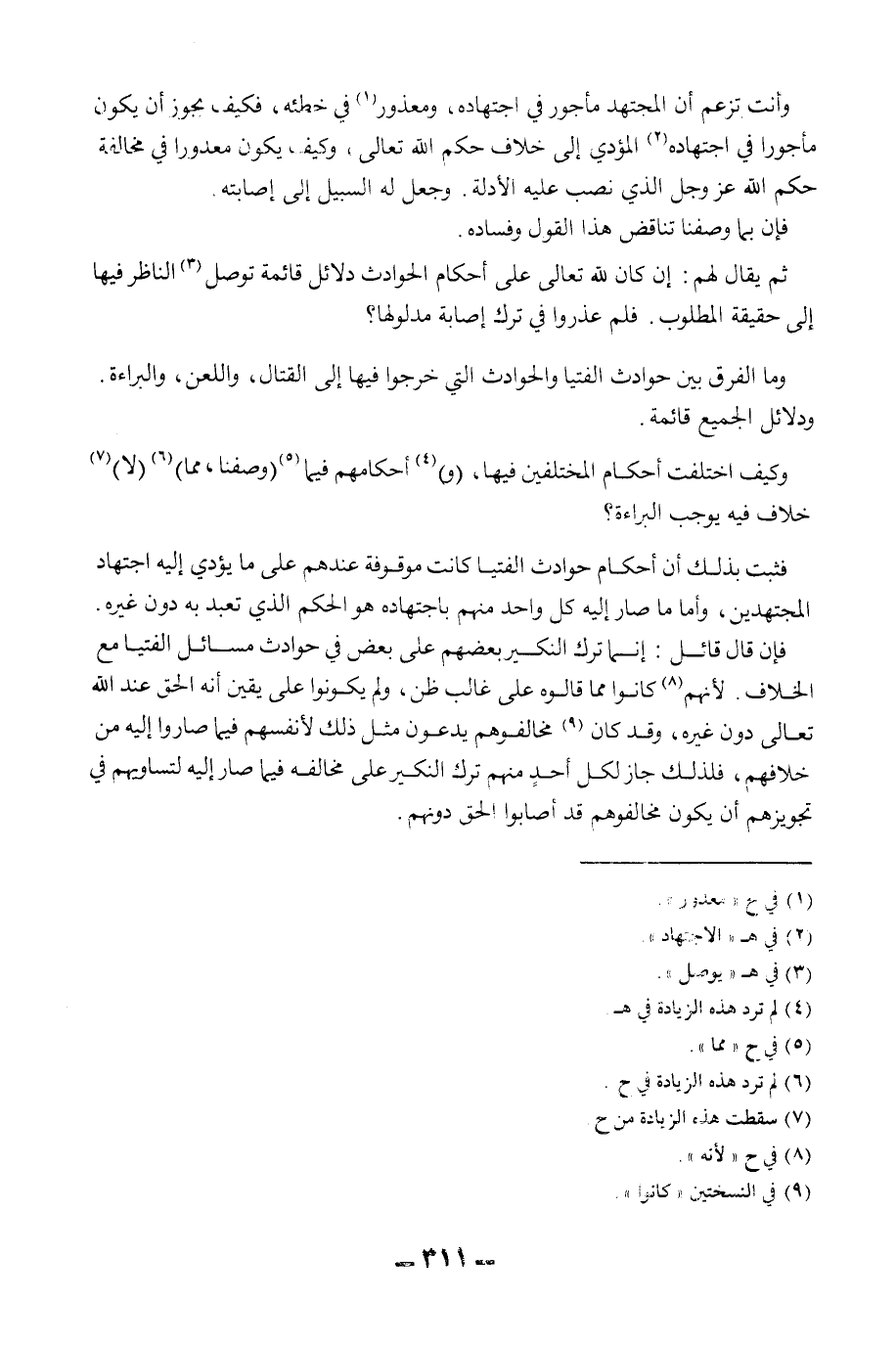 وَأَنْتَ تَزْعُمُ أَنَّ الْمُجْتَهِدَ مَأْجُورٌ فِي اجْتِهَادِهِ، وَمَعْذُورٌ فِي خَطَئِهِ، فَكَيْفَ يَجُوزُ أَنْ يَكُونَ مَأْجُورًا فِي اجْتِهَادِهِ الْمُؤَدِّي إلَى خِلَافِ حُكْمِ اللَّهِ تَعَالَى، وَكَيْفَ يَكُونُ مَعْذُورًا فِي مُخَالَفَةِ حُكْمِ اللَّهِ عَزَّ وَجَلَّ الَّذِي نَصَبَ عَلَيْهِ الْأَدِلَّةَ. وَجَعَلَ لَهُ السَّبِيلَ إلَى إصَابَتِهِ. فَإِنَّ بِمَا وَصَفْنَا تَنَاقُضَ هَذَا الْقَوْلِ وَفَسَادَهُ. ثُمَّ يُقَالُ لَهُمْ: إنْ كَانَ لِلَّهِ تَعَالَى عَلَى أَحْكَامِ الْحَوَادِثِ دَلَائِلُ قَائِمَةٌ تُوَصِّلُ النَّاظِرَ فِيهَا إلَى حَقِيقَةِ الْمَطْلُوبِ. فَلِمَ عُذِرُوا فِي تَرْكِ إصَابَةِ مَدْلُولِهَا؟ .