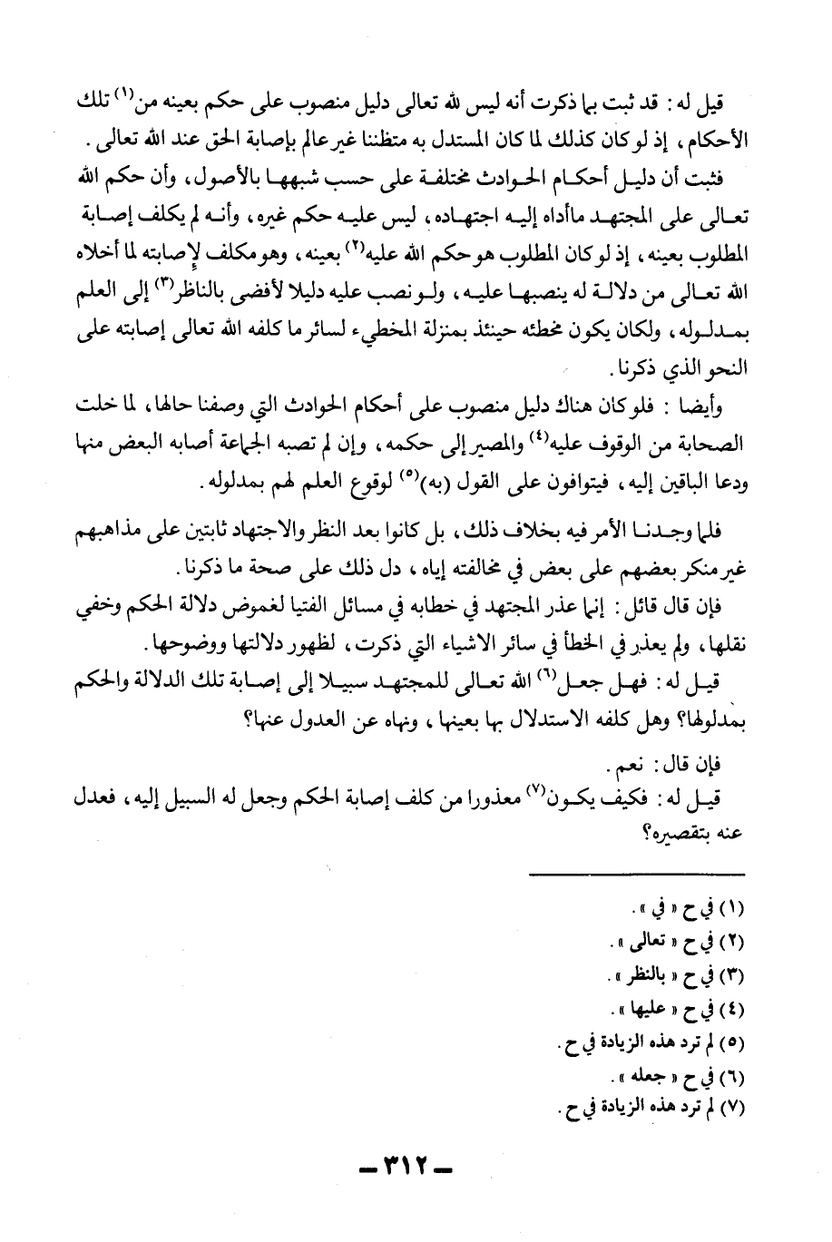 فَلَمَّا وَجَدْنَا الْأَمْرَ فِيهِ بِخِلَافِ ذَلِكَ، بَلْ كَانُوا بَعْدَ النَّظَرِ وَالِاجْتِهَادِ ثَابِتِينَ عَلَى مَذَاهِبِهِمْ غَيْرَ مُنْكِرٍ بَعْضُهُمْ عَلَى بَعْضٍ فِي مُخَالَفَتِهِ إيَّاهُ، دَلَّ ذَلِكَ عَلَى صِحَّةِ مَا ذَكَرْنَا. فَإِنْ قَالَ قَائِلٌ: إنَّمَا عُذِرَ الْمُجْتَهِدُ فِي خِطَابِهِ فِي مَسَائِلِ الْفُتْيَا لِغُمُوضِ دَلَالَةِ الْحُكْمِ وَخَفْيِ نَقْلِهَا، وَلَمْ يُعْذَرْ فِي الْخَطَأِ فِي سَائِرِ الْأَشْيَاءِ الَّتِي ذُكِرَتْ، لِظُهُورِ دَلَالَتِهَا وَوُضُوحِهَا. قِيلَ لَهُ: فَهَلْ جَعَلَ اللَّهُ تَعَالَى لِلْمُجْتَهِدِ سَبِيلًا إلَى إصَابَةِ تِلْكَ الدَّلَالَةِ وَالْحُكْمِ بِمَدْلُولِهَا؟ وَهَلْ كَلَّفَهُ الِاسْتِدْلَالَ بِهَا بِعَيْنِهَا، وَنَهَاهُ عَنْ الْعُدُولِ عَنْهَا؟ فَإِنْ قَالَ: نَعَمْ. قِيلَ لَهُ: فَكَيْفَ يَكُونُ مَعْذُورًا مَنْ كُلِّفَ إصَابَةَ الْحُكْمِ وَجُعِلَ لَهُ السَّبِيلُ إلَيْهِ، فَعَدَلَ عَنْهُ بِتَقْصِيرِهِ؟